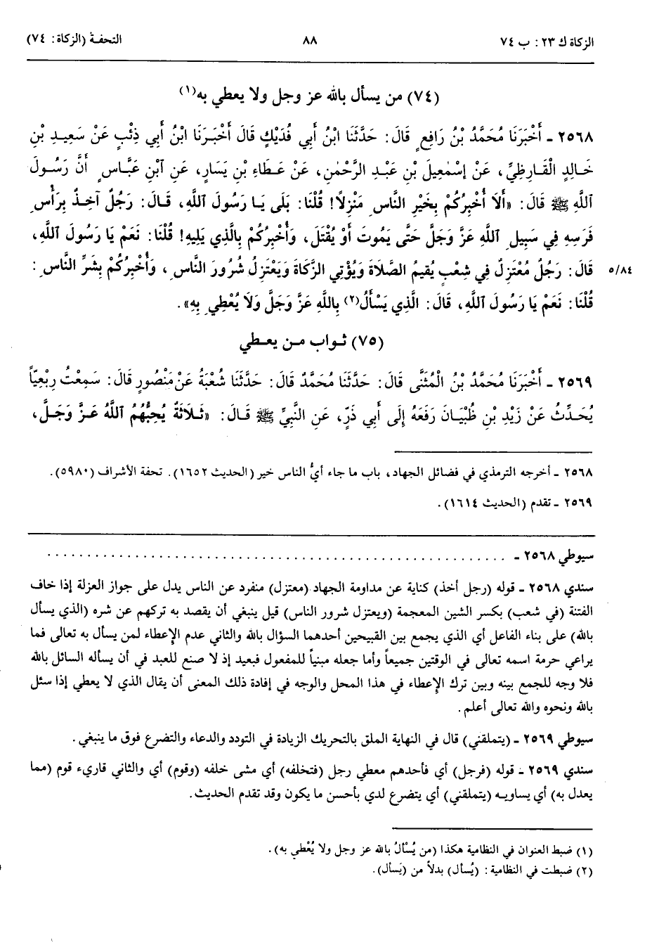 مَنْ يُسْأَلُ بِاللَّهِ عَزَّ وَجَلَّ وَلَا يُعْطِي بِهِ 2568 - أَخْبَرَنَا مُحَمَّدُ بْنُ رَافِعٍ قَالَ حَدَّثَنَا ابْنُ أَبِي فُدَيْكٍ قَالَ أَنْبَأَنَا ابْنُ أَبِي ذِئْبٍ عَنْ سَعِيدِ بْنِ خَالِدٍ الْقَارِظِيِّ عَنْ إِسْمَعِيلَ بْنِ عَبْدِ الرَّحْمَنِ عَنْ عَطَاءِ بْنِ يَسَارٍ عَنْ ابْنِ عَبَّاسٍ أَنَّ رَسُولَ اللَّهِ صَلَّى اللَّهُ عَلَيْهِ وَسَلَّمَ قَالَ أَلَا أُخْبِرُكُمْ بِخَيْرِ النَّاسِ مَنْزِلًا قُلْنَا بَلَى يَا رَسُولَ اللَّهِ قَالَ رَجُلٌ آخِذٌ بِرَأْسِ فَرَسِهِ فِي سَبِيلِ اللَّهِ عَزَّ وَجَلَّ حَتَّى يَمُوتَ أَوْ يُقْتَلَ وَأُخْبِرُكُمْ بِالَّذِي يَلِيهِ قُلْنَا نَعَمْ يَا رَسُولَ اللَّهِ قَالَ رَجُلٌ مُعْتَزِلٌ فِي شِعْبٍ يُقِيمُ الصَّلَاةَ وَيُؤْتِي الزَّكَاةَ وَيَعْتَزِلُ شُرُورَ النَّاسِ وَأُخْبِرُكُمْ بِشَرِّ النَّاسِ قُلْنَا نَعَمْ يَا رَسُولَ اللَّهِ قَالَ الَّذِي يُسْأَلُ بِاللَّهِ عَزَّ وَجَلَّ وَلَا يُعْطِي بِهِ