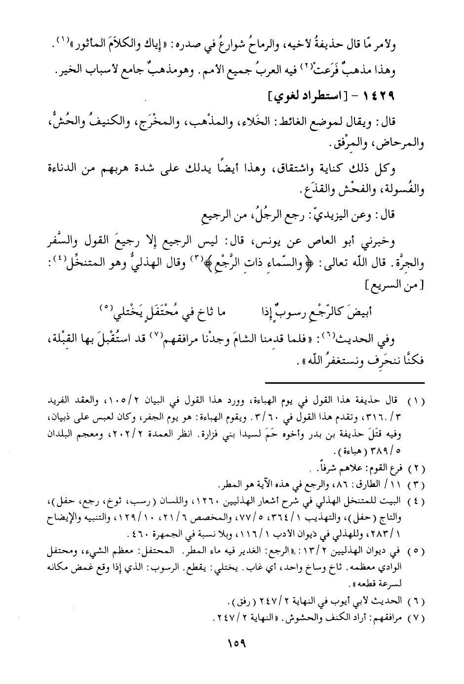 [4] البيت للمتنخل الهذلي في شرح أشعار الهذليين 1260، واللسان (رسب، ثوخ، رجع، حفل) ، والتاج (حفل) ، والتهذيب 1/364، 5/77، والمخصص 6/21، 10/129، والتنبيه والإيضاح 1/283، وللهذلي في ديوان الأدب 1/116، وبلا نسبة في الجمهرة 460.