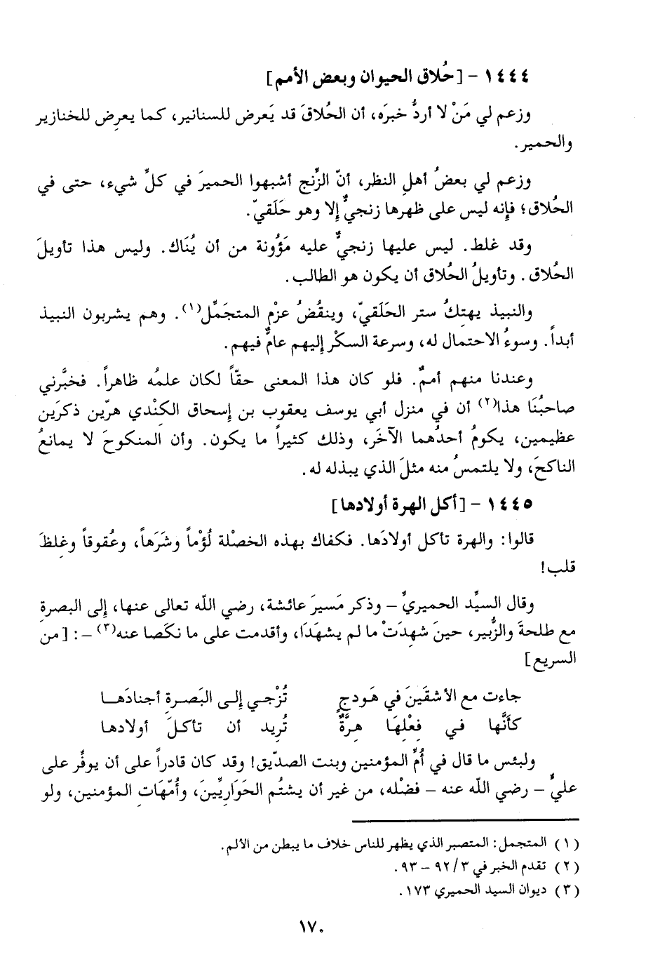 قالوا: والهرة تأكل أولادها. فكفاك بهذه الخصلة لؤما وشرها، وعقوقا وغلظ قلب! وقال السيّد الحميريّ- وذكر مسير عائشة، رضي الله تعالى عنها، إلى البصرة مع طلحة والزّبير، حين شهدت ما لم يشهدا، وأقدمت على ما نكصا عنه [3]-: [من السريع]