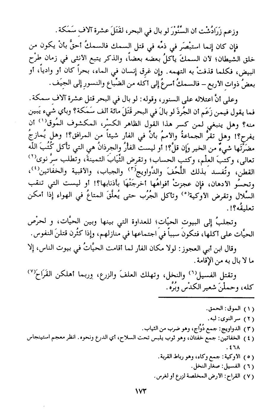 فما يقول فيمن زعم أن الجرذ لو بال في البحر قتل مائة ألف سمكة؟ وبأي شيء يبين منه؟ وهل ينبغي لمن كسر هذا القول الظاهر الكسر، المكشوف الموق [1] أن يفرح؟! وهل تقرّ الجماعة والأمم بأنّ في الفأر شيئا من المرافق؟! وهل يمازج مضرّتها شيء من الخير وإن قلّ؟! أو ليست الفأر والجرذان هي التي تأكل كتب الله تعالى، وكتب العلم، وكتب الحساب؛ وتقرض الثّياب الثمينة، وتطلب سرّ نوى [2] القطن، وتفسد بذلك اللّحف والدّواويج [3] والجباب، والأقبية والخفاتين [4] ، وتحسو الأدهان، فإن عجزت أفواهها أخرجتها بأذنابها؟! أو ليست التي تنقب السّلال وتقرض الأوكية [5] وتأكل الجرب حتى يعلّق المتاع في الهواء إذا أمكن تعليقه؟!.