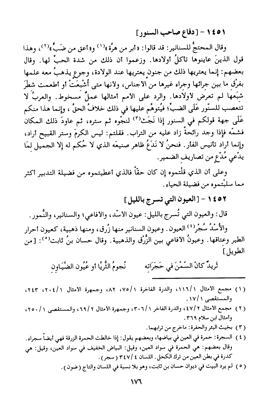 والأسد سجر [4] العيون. وعيون السنانير منها زرق، ومنها ذهبية، كعيون أحرار الطير وعتاقها. وعيون الأفاعي بين الزّرق والذهبية. وقال حسان بن ثابت [5] : [من الطويل]