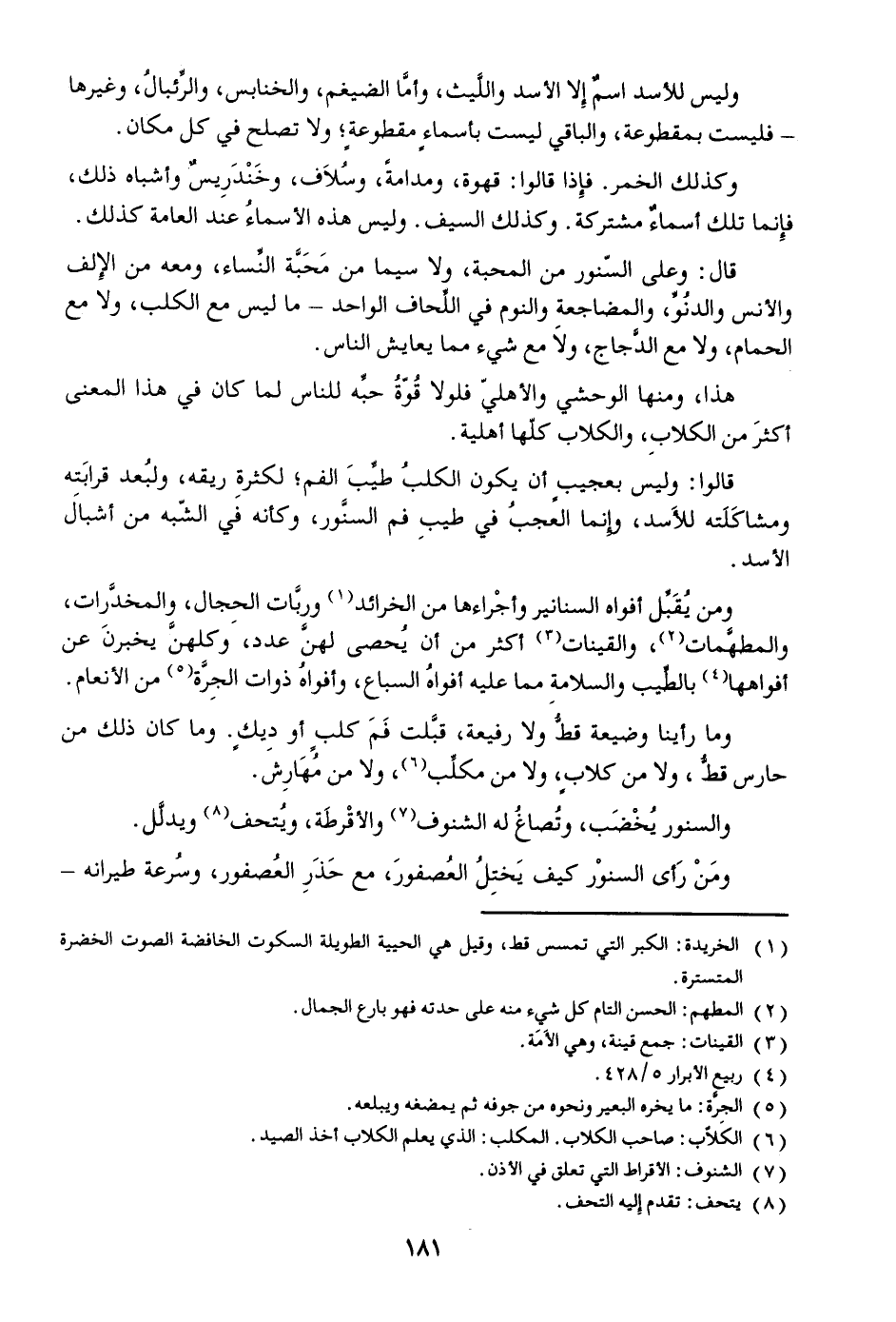ومن يقبّل أفواه السنانير وأجراءها من الخرائد [1] وربّات الحجال، والمخدّرات، والمطهّمات [2] ، والقينات [3] أكثر من أن يحصى لهنّ عدد، وكلهنّ يخبرن عن أفواهها [4] بالطّيب والسلامة مما عليه أفواه السباع، وأفواه ذوات الجرّة [5] من الأنعام.