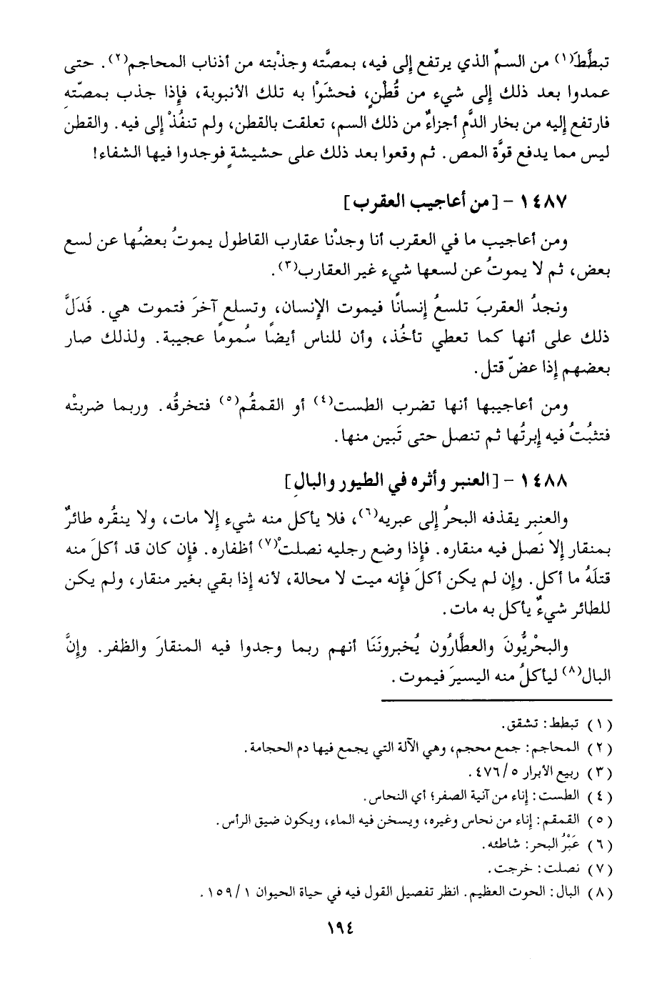 ومن أعاجيب ما في العقرب أنا وجدنا عقارب القاطول يموت بعضها عن لسع بعض، ثم لا يموت عن لسعها شيء غير العقارب [3] .