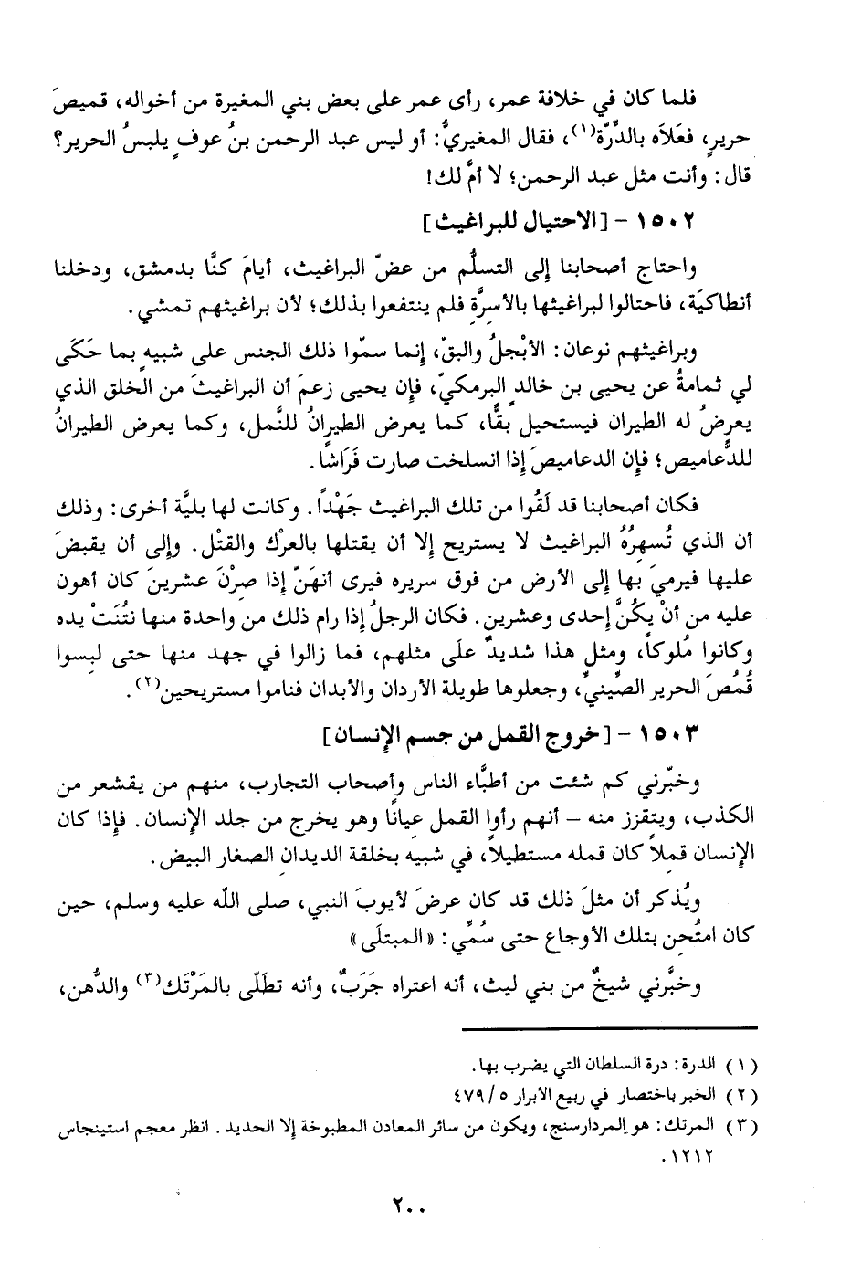 فكان أصحابنا قد لقوا من تلك البراغيث جهدا. وكانت لها بليّة أخرى: وذلك أن الذي تسهره البراغيث لا يستريح إلا أن يقتلها بالعرك والقتل. وإلى أن يقبض عليها فيرمي بها إلى الأرض من فوق سريره فيرى أنهنّ إذا صرن عشرين كان أهون عليه من أن يكنّ إحدى وعشرين. فكان الرجل إذا رام ذلك من واحدة منها نتنت يده وكانوا ملوكا، ومثل هذا شديد على مثلهم، فما زالوا في جهد منها حتى لبسوا قمص الحرير الصّينيّ، وجعلوها طويلة الأردان والأبدان فناموا مستريحين [2] .
