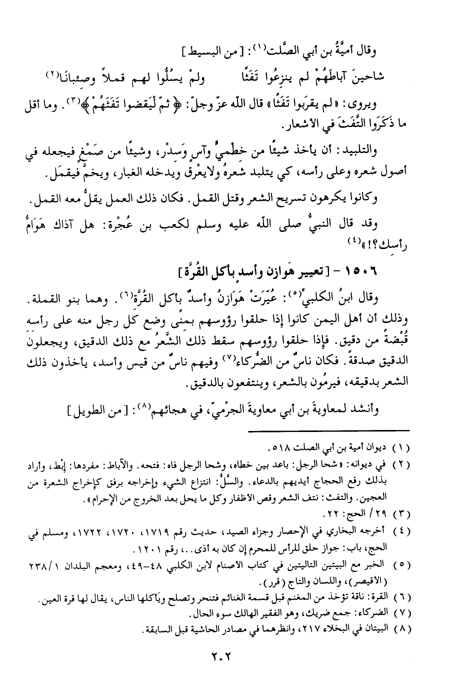 [2] في ديوانه: «شحا الرجل: باعد بين خطاه، وشحا الرجل فاه: فتحه. والآباط: مفردها: إبط، وأراد بذلك رفع الحجاج أيديهم بالدعاء. والسّلّ: انتزاع الشيء وإخراجه برفق كإخراج الشعرة من العجين. والتفث: نتف الشعر وقص الأظفار وكل ما يحل بعد الخروج من الإحرام» .
