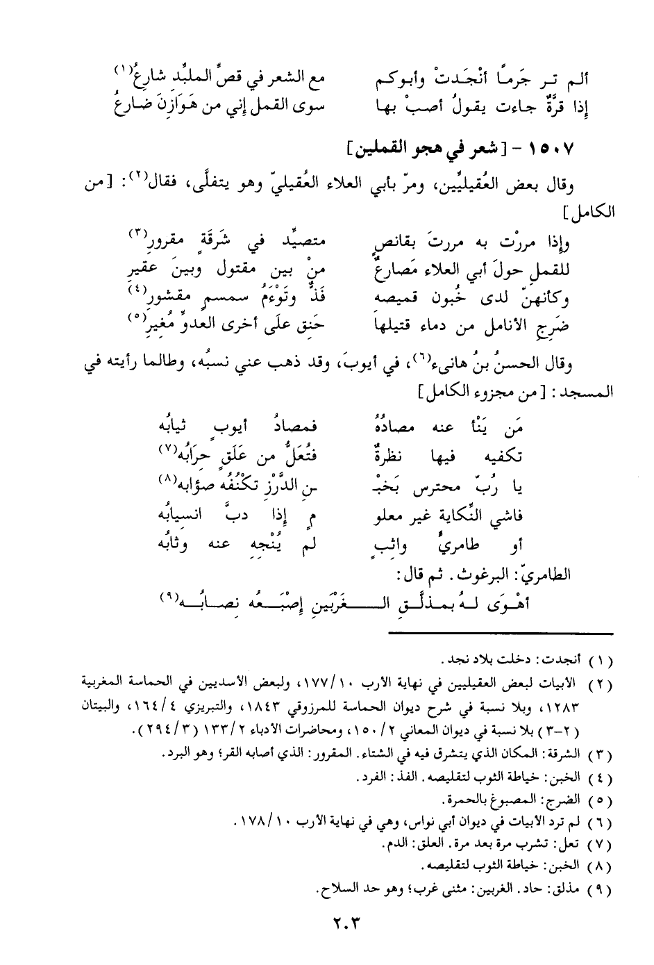 [2] الأبيات لبعض العقيليين في نهاية الأرب 10/177، ولبعض الأسديين في الحماسة المغربية 1283، وبلا نسبة في شرح ديوان الحماسة للمرزوقي 1843، والتبريزي 4/164، والبيتان (2- 3) بلا نسبة في ديوان المعاني 2/150، ومحاضرات الأدباء 2/133 (3/294) .