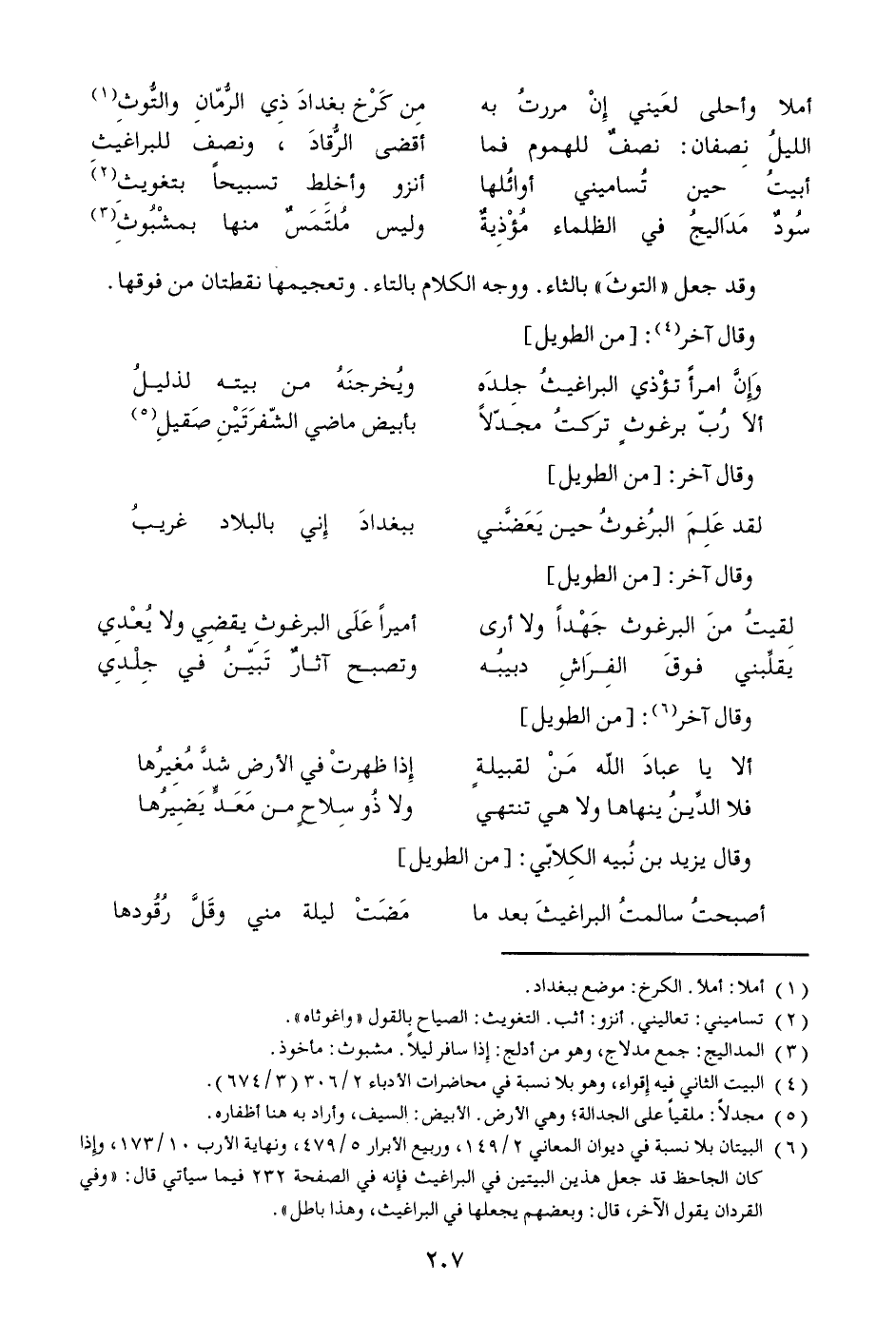 [6] البيتان بلا نسبة في ديوان المعاني 2/149، وربيع الأبرار 5/479، ونهاية الأرب 10/173، وإذا كان الجاحظ قد جعل هذين البيتين في البراغيث فإنه في الصفحة 232 فيما سيأتي قال: «وفي القردان يقول الآخر، قال: وبعضهم يجعلها في البراغيث، وهذا باطل» .