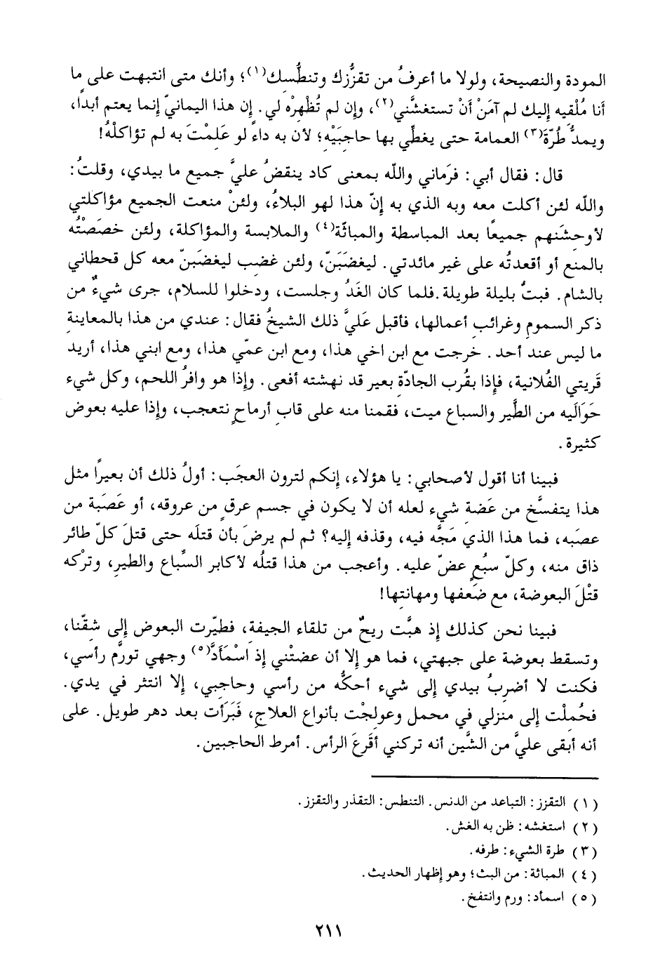 والله لئن أكلت معه وبه الذي به إنّ هذا لهو البلاء، ولئن منعت الجميع مؤاكلتي لأوحشنهم جميعا بعد المباسطة والمباثّة [4] والملابسة والمؤاكلة، ولئن خصصته بالمنع أو أقعدته على غير مائدتي. ليغضبنّ، ولئن غضب ليغضبنّ معه كل قحطاني بالشام. فبت بليلة طويلة. فلما كان الغد وجلست، ودخلوا للسلام، جرى شيء من ذكر السموم وغرائب أعمالها، فأقبل عليّ ذلك الشيخ فقال: عندي من هذا بالمعاينة ما ليس عند أحد. خرجت مع ابن اخي هذا، ومع ابن عمّي هذا، ومع ابني هذا، أريد قريتي الفلانية، فإذا بقرب الجادّة بعير قد نهشته أفعى. وإذا هو وافر اللحم، وكل شيء حواليه من الطّير والسباع ميت، فقمنا منه على قاب أرماح نتعجب، وإذا عليه بعوض كثيرة.