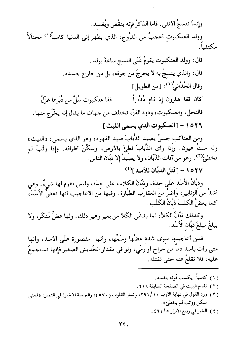 ومن العناكب جنس يصيد الذّباب صيد الفهود، وهو الذي يسمى: «الليث» وله ستّ عيون. وإذا رأى الذّباب لطئ بالأرض، وسكّن أطرافه. وإذا وثب لم يخطئ [3] . وهو من آفات الذّبّان، ولا يصيد إلا ذبّان الناس.
