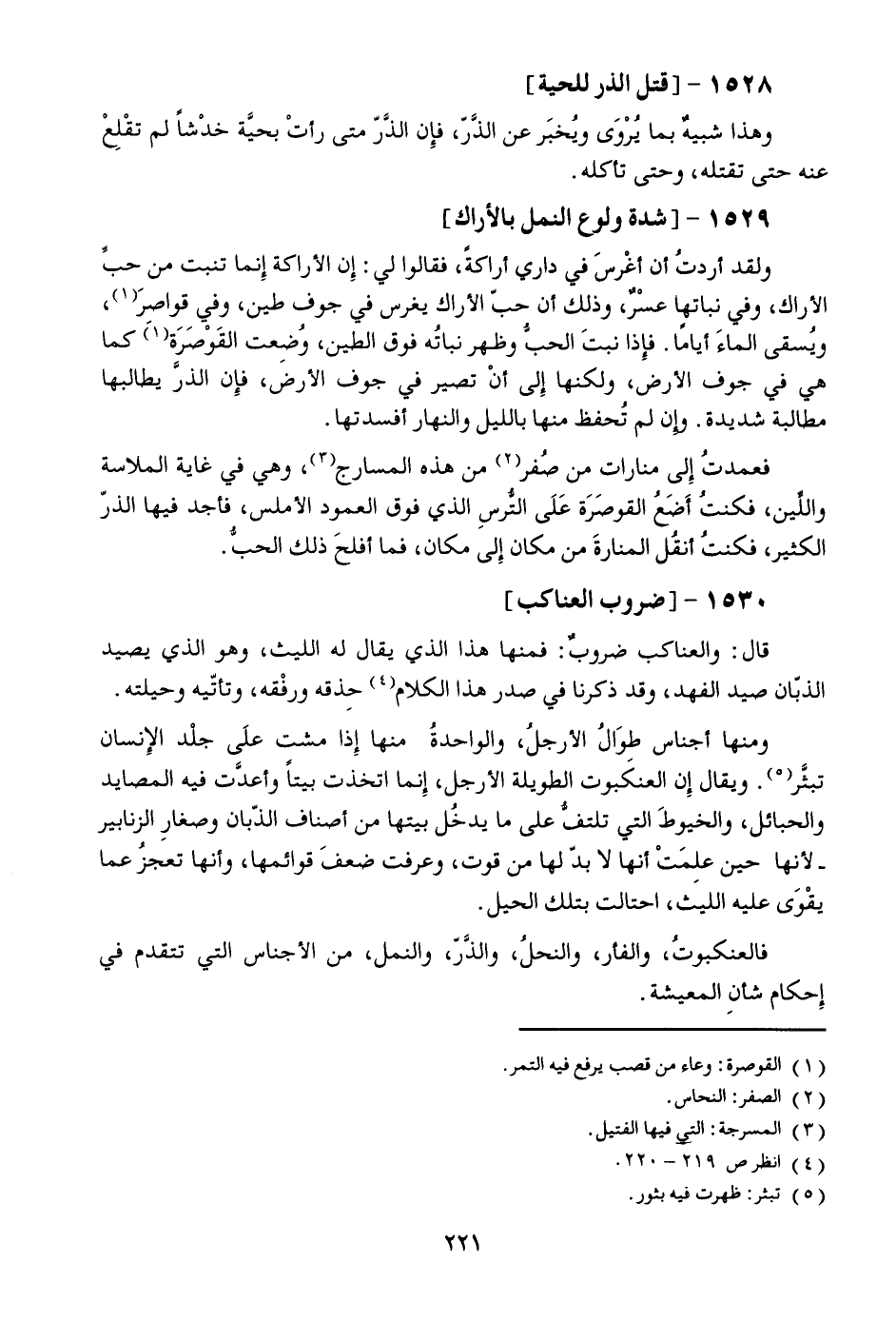 ولقد أردت أن أغرس في داري أراكة، فقالوا لي: إن الأراكة إنما تنبت من حبّ الأراك، وفي نباتها عسر، وذلك أن حبّ الأراك يغرس في جوف طين، وفي قواصر [1] ، ويسقى الماء أياما. فإذا نبت الحبّ وظهر نباته فوق الطين، وضعت القوصرة [1] كما هي في جوف الأرض، ولكنها إلى أن تصير في جوف الأرض، فإن الذرّ يطالبها مطالبة شديدة. وإن لم تحفظ منها بالليل والنهار أفسدتها.