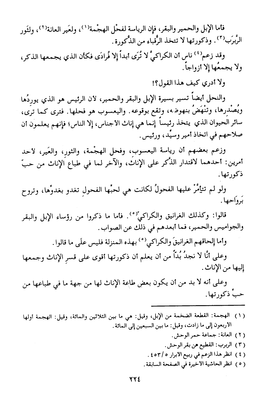 ولا أدري كيف هذا القول؟! والنحل أيضا تسير بسيرة الإبل والبقر والحمير، لأن الرئيس هو الذي يوردها ويصدرها، وتنهض بنهوضه، وتقع بوقوعه. واليعسوب هو فحلها. فترى كما ترى، سائر الحيوان الذي يتخذ رئيسا إنما هي إناث الأجناس، إلا الناس؛ فإنهم يعلمون أن صلاحهم في اتخاذ أمير وسيّد، ورئيس.