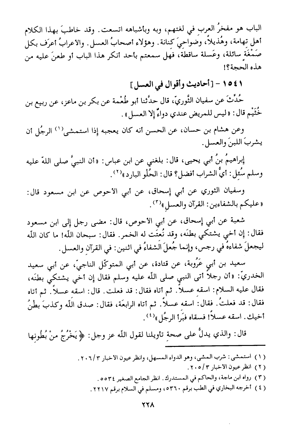 شعبة عن أبي إسحاق، عن أبي الأحوص، قال: مضى رجل إلى ابن مسعود فقال: إن أخي يشتكي بطنه، وقد نعتت له الخمر. فقال: سبحان الله! ما كان الله ليجعل شفاءه في رجس، وإنما جعل الشفاء في اثنين: في القرآن والعسل.