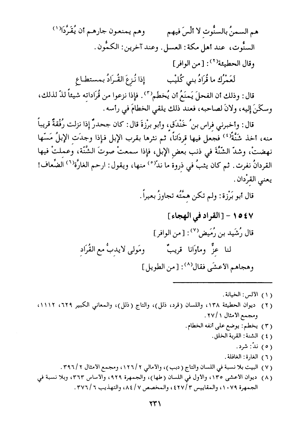 [2] ديوان الحطيئة 138، واللسان (قرد، ذلل) ، والتاج (ذلل) ، والمعاني الكبير 629، 1112، ومجمع الأمثال 1/27.