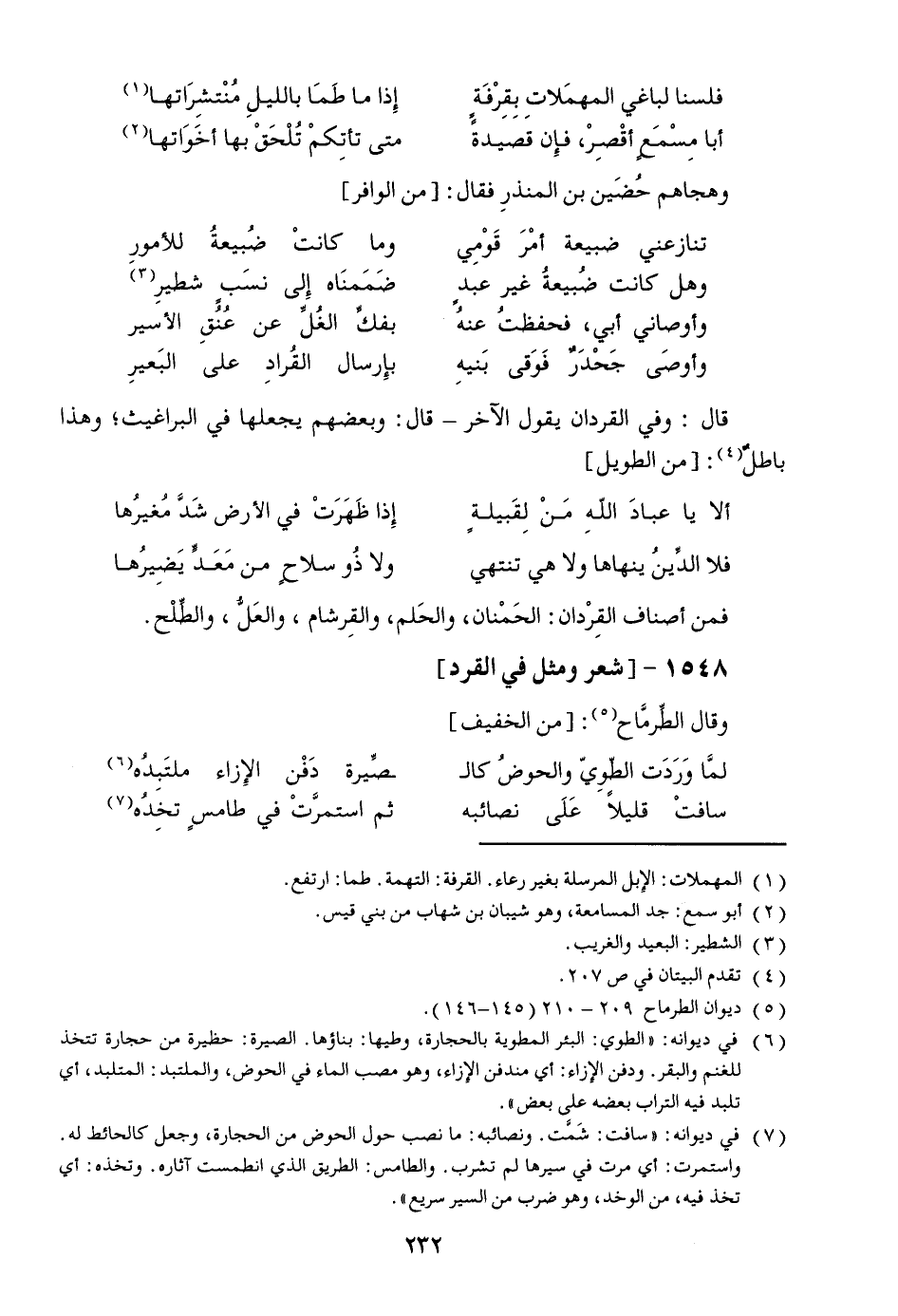 [6] في ديوانه: «الطوي: البئر المطوية بالحجارة، وطيها: بناؤها. الصيرة: حظيرة من حجارة تتخذ للغنم والبقر. ودفن الإزاء: أي مندفن الإزاء، وهو مصب الماء في الحوض، والملتبد: المتلبد، أي تلبد فيه التراب بعضه على بعض» .