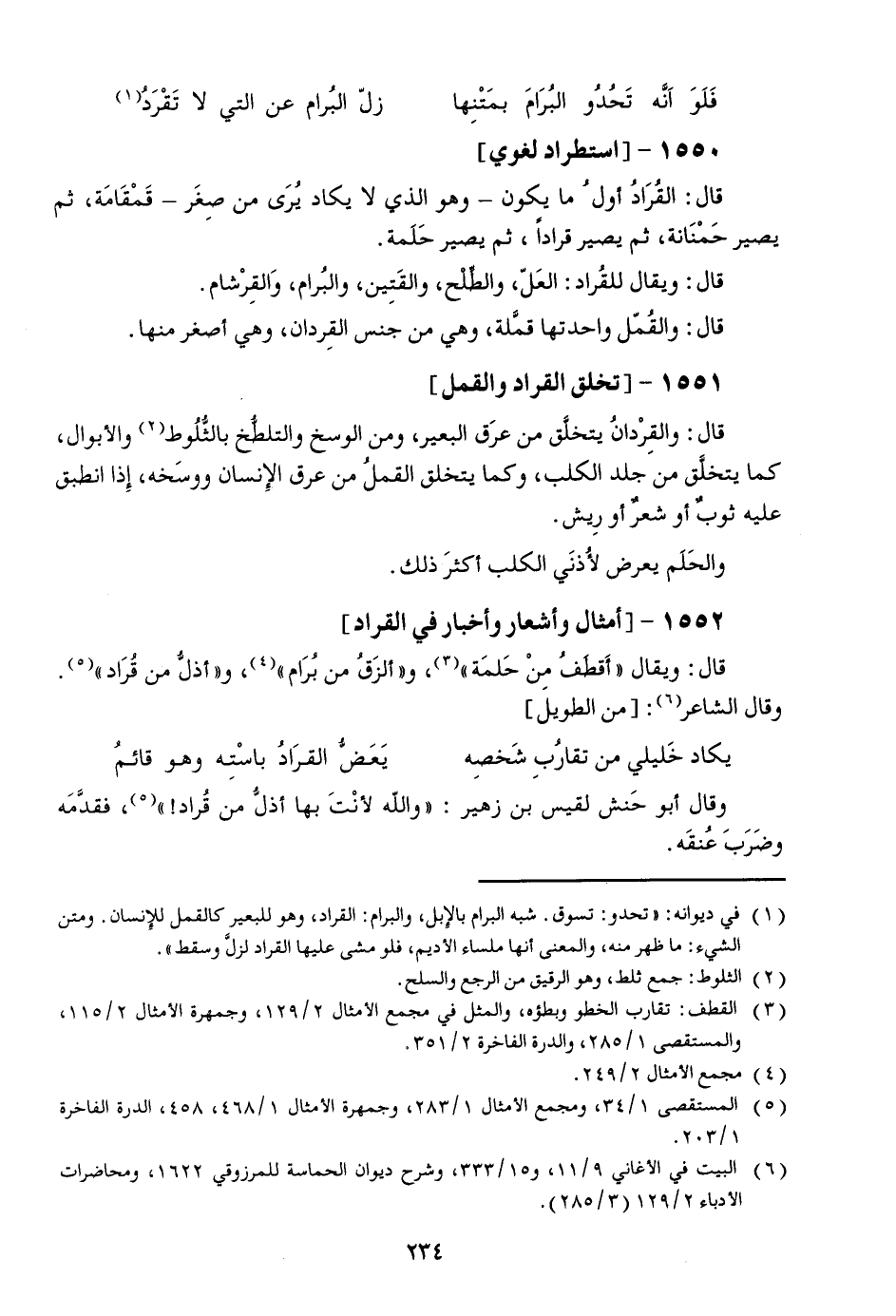 قال: والقردان يتخلّق من عرق البعير، ومن الوسخ والتلطّخ بالثّلوط [2] والأبوال، كما يتخلّق من جلد الكلب، وكما يتخلق القمل من عرق الإنسان ووسخه، إذا انطبق عليه ثوب أو شعر أو ريش.