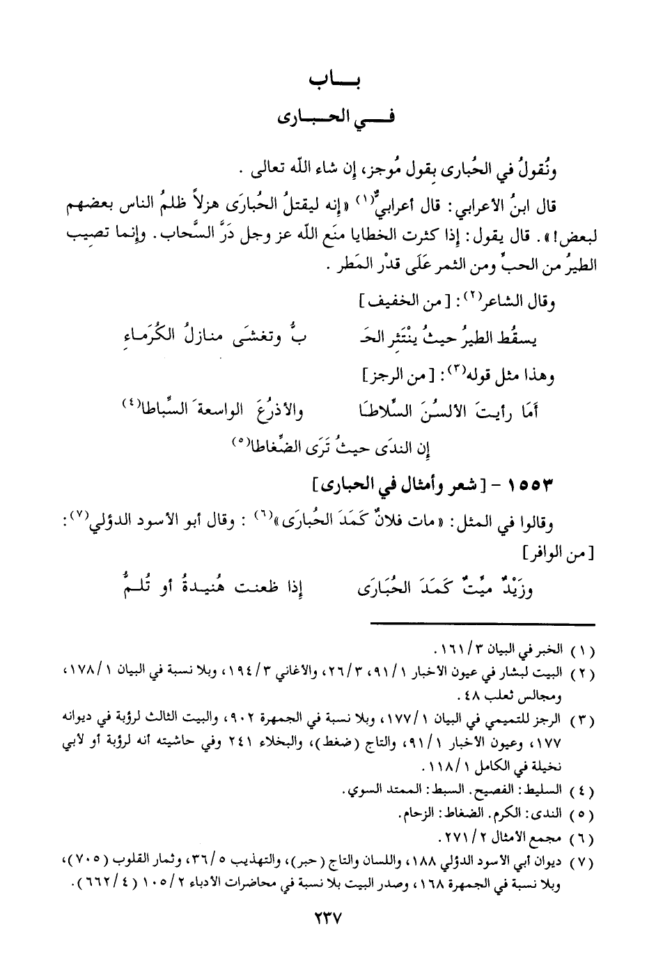 قال ابن الأعرابي: قال أعرابيّ [1] «إنه ليقتل الحبارى هزلا ظلم الناس بعضهم لبعض!» . قال يقول: إذا كثرت الخطايا منع الله عزّ وجلّ درّ السّحاب. وإنما تصيب الطير من الحبّ ومن الثمر على قدر المطر.