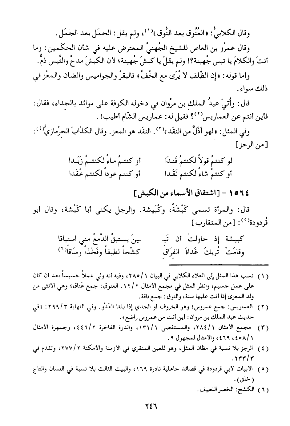 وقال الكلابيّ: «العنوق بعد النّوق» [1] ، ولم يقل: الحمل بعد الجمل.