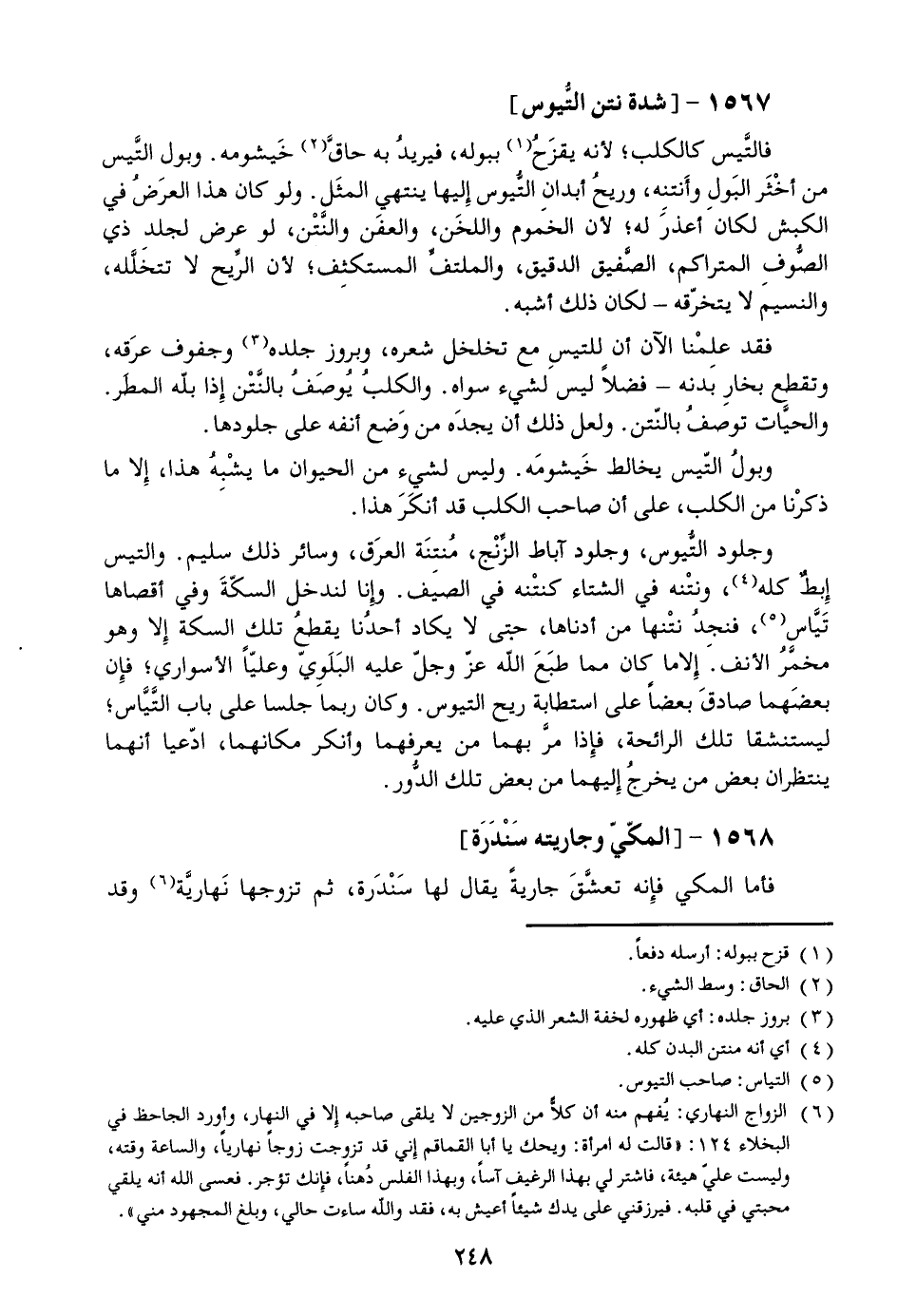 فالتّيس كالكلب؛ لأنه يقزح [1] ببوله، فيريد به حاقّ [2] خيشومه. وبول التّيس من أخثر البول وأنتنه، وريح أبدان التّيوس إليها ينتهي المثل. ولو كان هذا العرض في الكبش لكان أعذر له؛ لأن الخموم واللخن، والعفن والنّتن، لو عرض لجلد ذي الصّوف المتراكم، الصّفيق الدقيق، والملتفّ المستكثف؛ لأن الرّيح لا تتخلّله، والنسيم لا يتخرّقه- لكان ذلك أشبه.