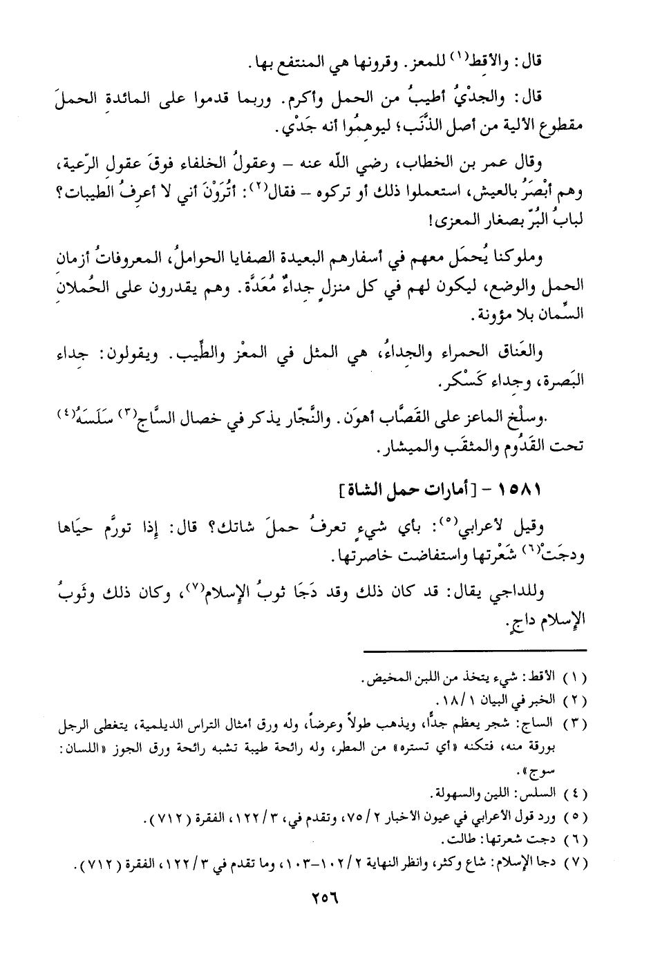 وقيل لأعرابي [5] : بأي شيء تعرف حمل شاتك؟ قال: إذا تورّم حياها ودجت [6] شعرتها واستفاضت خاصرتها.