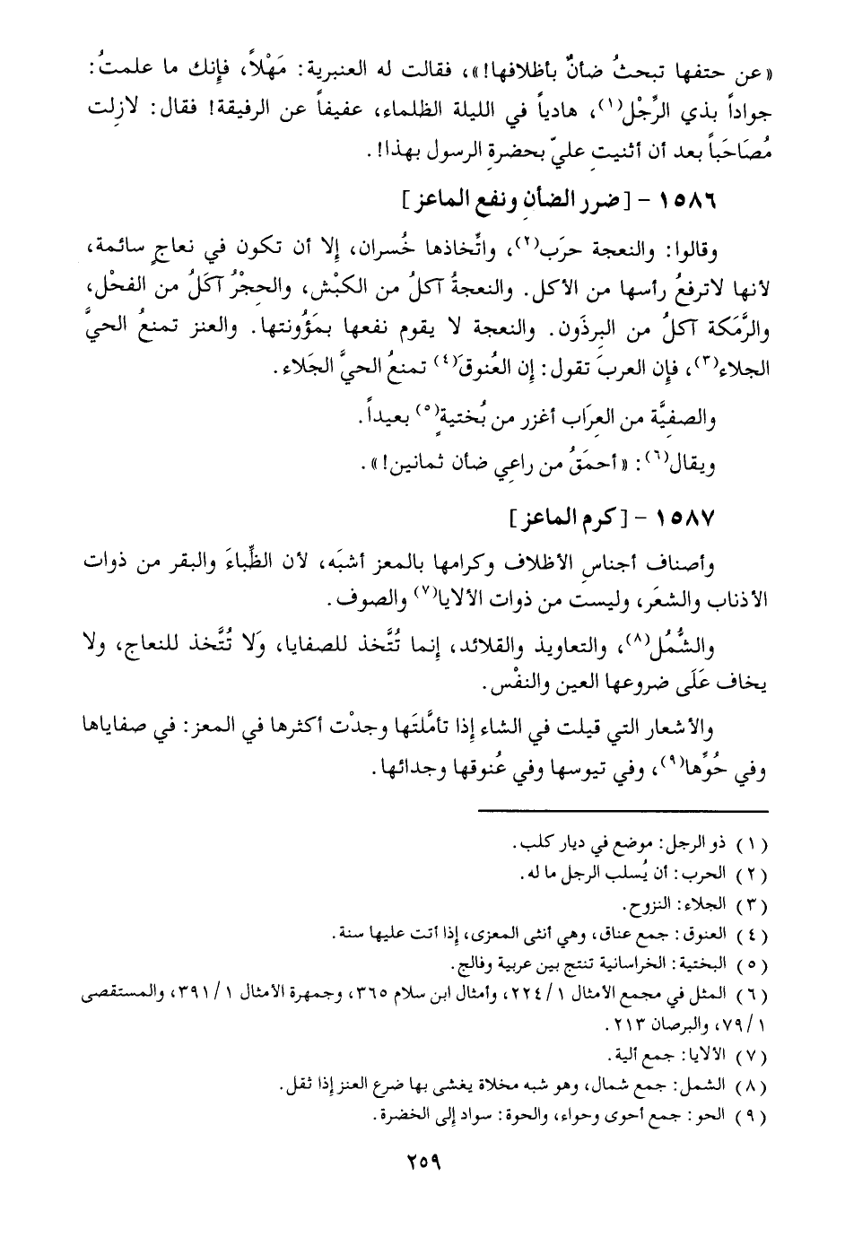 والأشعار التي قيلت في الشاء إذا تأمّلتها وجدت أكثرها في المعز: في صفاياها وفي حوّها [9] ، وفي تيوسها وفي عنوقها وجدائها.