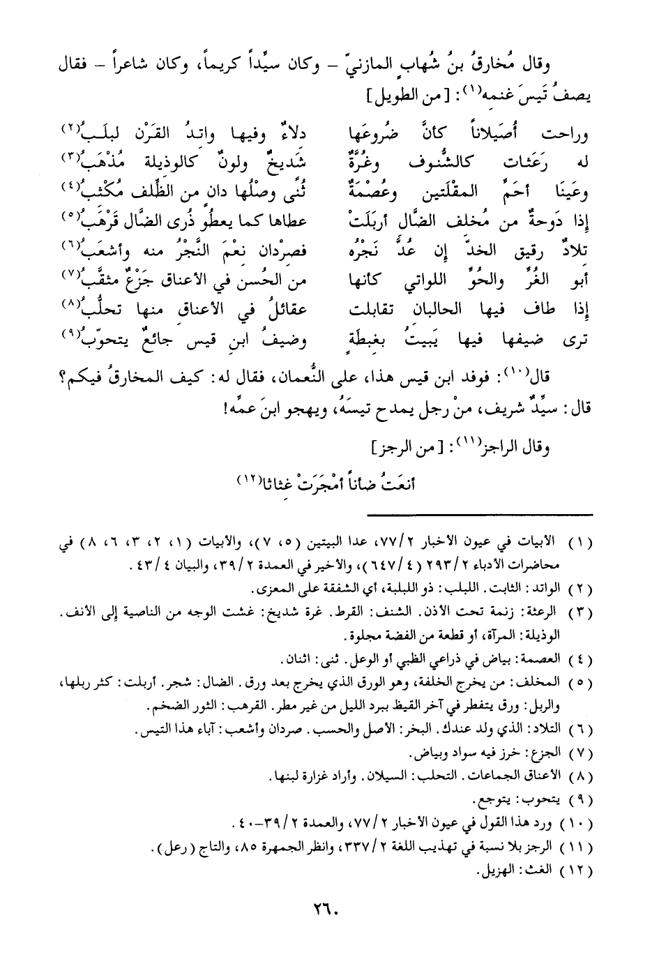 وقال مخارق بن شهاب المازنيّ- وكان سيّدا كريما، وكان شاعرا- فقال يصف تيس غنمه [1] : [من الطويل]