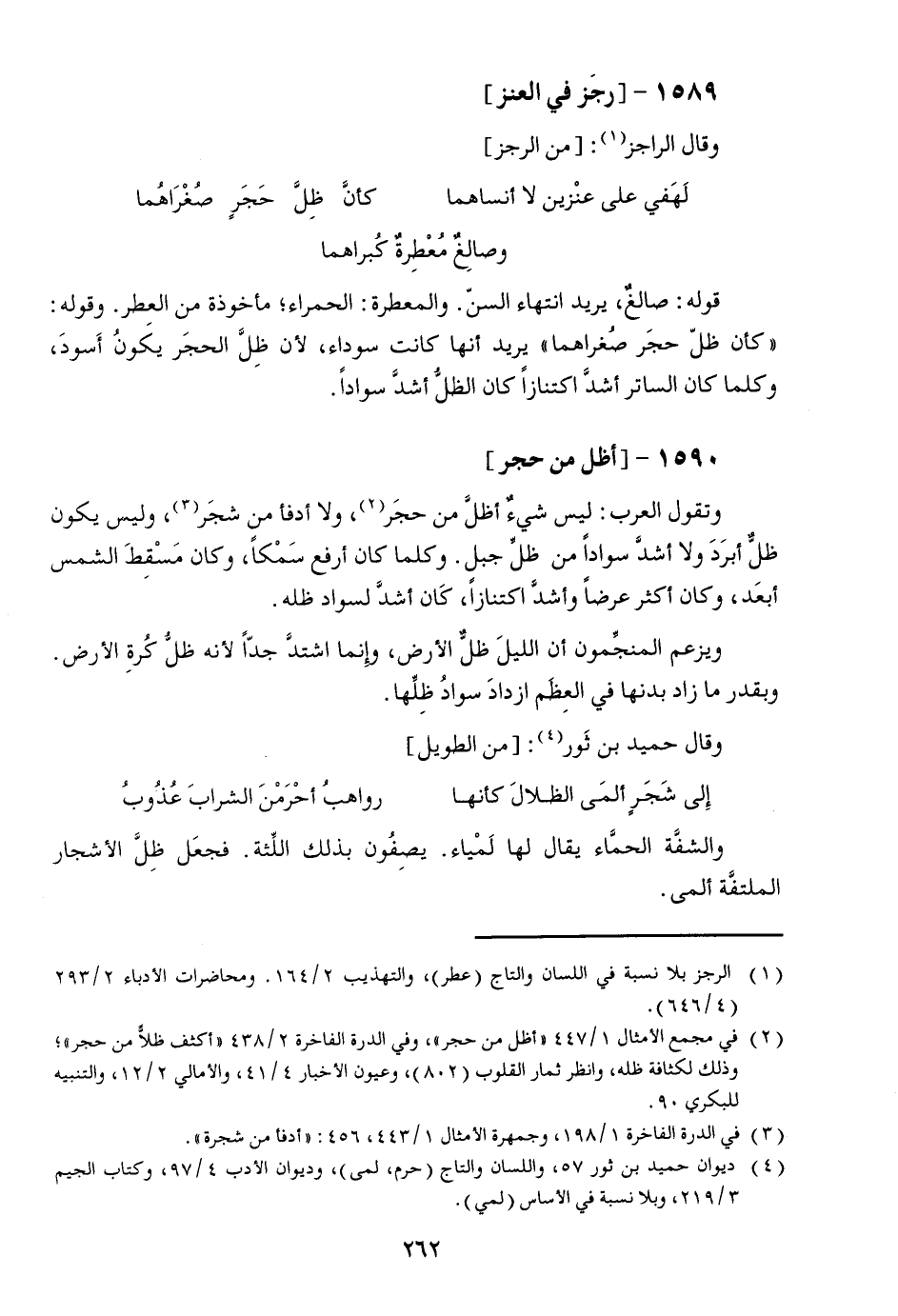 [2] في مجمع الأمثال 1/447 «أظل من حجر» ، وفي الدرة الفاخرة 2/438 «أكثف ظلّا من حجر» ؛ وذلك لكثافة ظله، وانظر ثمار القلوب (802) ، وعيون الأخبار 4/41، والأمالي 2/12، والتنبيه للبكري 90.