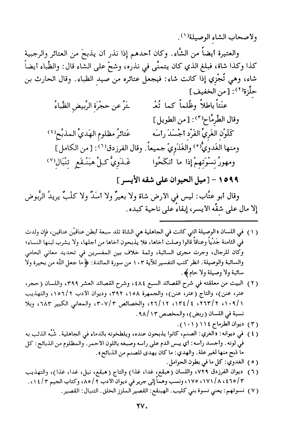 [1] في اللسان «الوصيلة التي كانت في الجاهلية هي الشاة تلد سبعة أبطن عناقين عناقين، فإن ولدت في الثامنة جديا وعناقا قالوا وصلت أخاها، فلا يذبحون أخاها من أجلها، ولا يشرب لبنها النساء؛ وكان للرجال، وجرت مجرى السائبة، وثمة خلاف بين المفسرين في تحديد معاني الحامي والسائبة والوصيلة. انظر كتب التفسير للآية 103 من سورة المائدة: ما جَعَلَ اللَّهُ مِنْ بَحِيرَةٍ وَلا سائِبَةٍ وَلا وَصِيلَةٍ وَلا حامٍ.