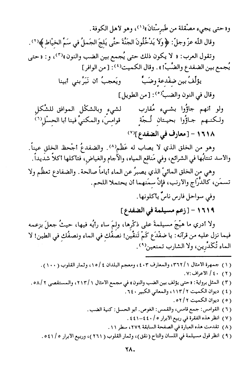 وتقول العرب: «لا يكون ذلك حتى يجمع بين الضب والنون» [3] ، و: «حتى يجمع بين الضفدع والضّبّ!» . وقال الكميت [4] : [من الوافر]