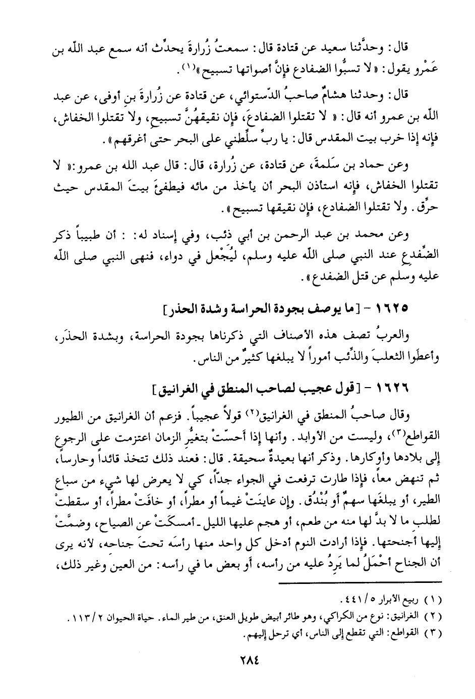 قال: وحدّثنا سعيد عن قتادة قال: سمعت زرارة يحدّث أنه سمع عبد الله بن عمرو يقول: «لا تسبّوا الضفادع فإنّ أصواتها تسبيح» [1] .
