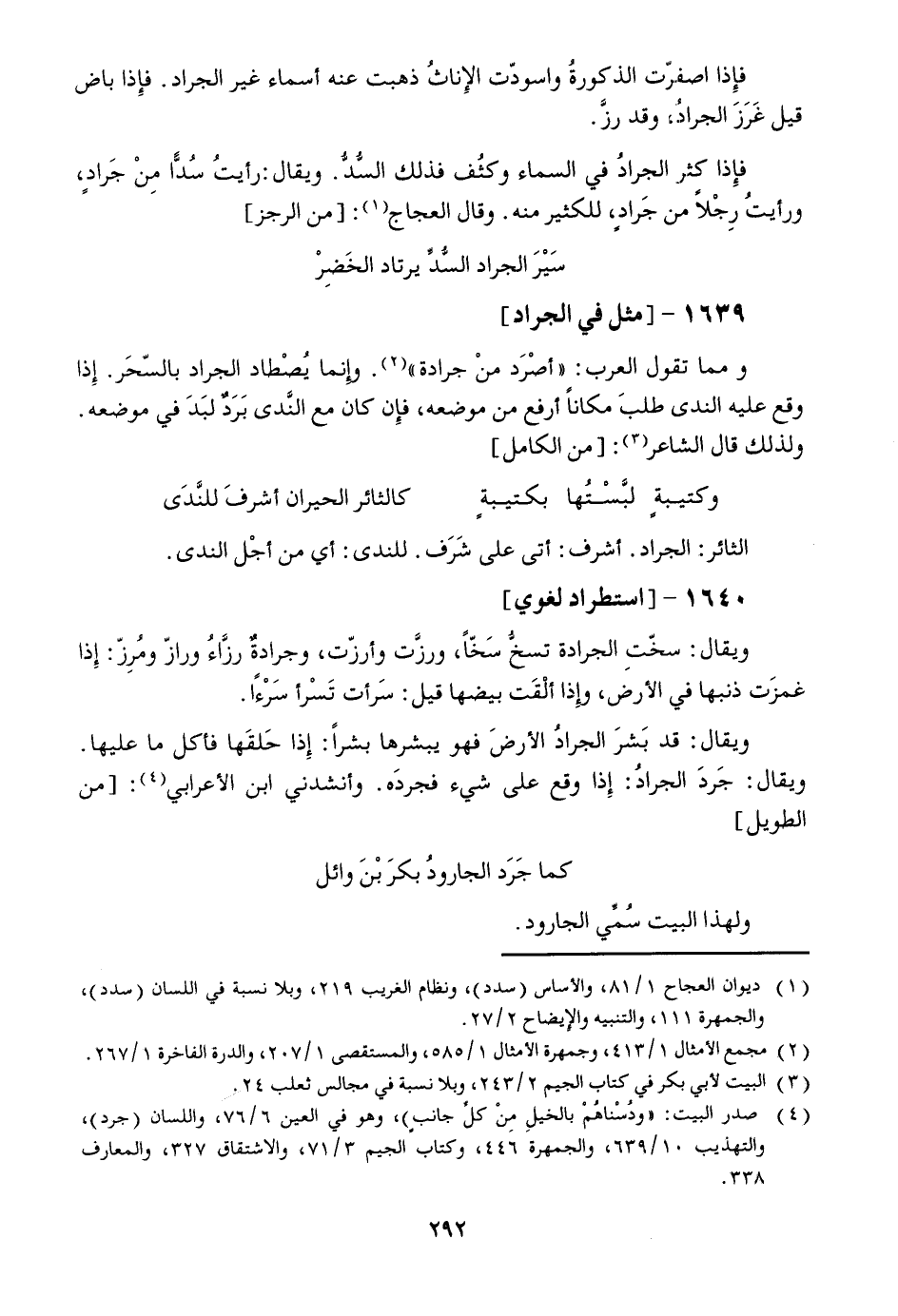 ومما تقول العرب: «أصرد من جرادة» [2] . وإنما يصطاد الجراد بالسّحر. إذا وقع عليه الندى طلب مكانا أرفع من موضعه، فإن كان مع النّدى برد لبد في موضعه. ولذلك قال الشاعر [3] : [من الكامل]