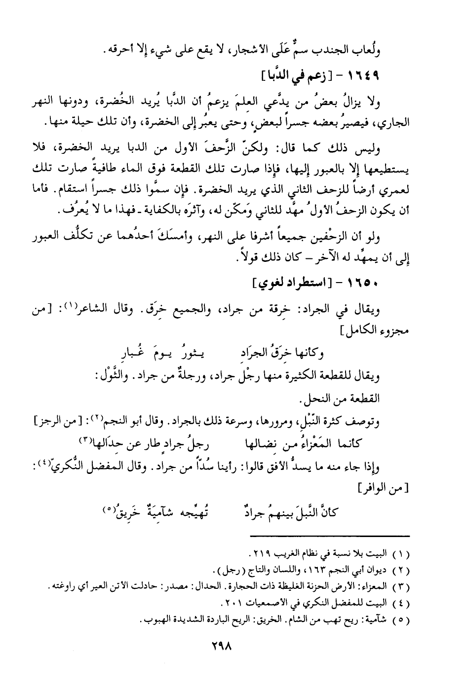 وليس ذلك كما قال: ولكنّ الزّحف الأول من الدبا يريد الخضرة، فلا يستطيعها إلا بالعبور إليها، فإذا صارت تلك القطعة فوق الماء طافية صارت تلك لعمري أرضا للزحف الثاني الذي يريد الخضرة. فإن سمّوا ذلك جسرا استقام. فأما أن يكون الزحف الأول مهّد للثاني ومكّن له، وآثره بالكفاية- فهذا ما لا يعرف.