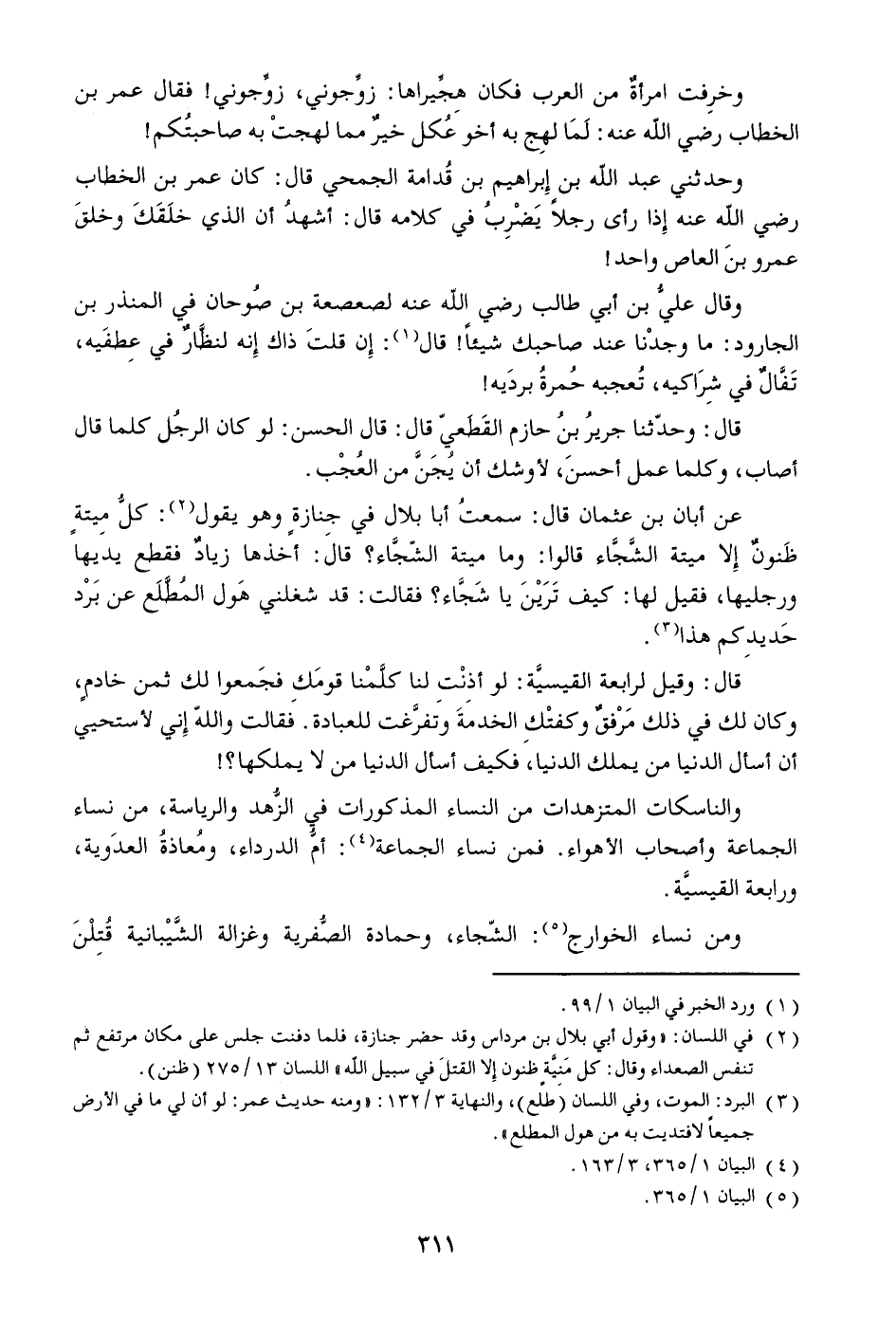 وخرفت امرأة من العرب فكان هجّيراها: زوّجوني، زوّجوني! فقال عمر بن الخطاب رضي الله عنه: لما لهج به أخو عكل خير مما لهجت به صاحبتكم! وحدثني عبد الله بن إبراهيم بن قدامة الجمحي قال: كان عمر بن الخطاب رضي الله عنه إذا رأى رجلا يضرب في كلامه قال: أشهد أن الذي خلقك وخلق عمرو بن العاص واحد! وقال عليّ بن أبي طالب رضي الله عنه لصعصعة بن صوحان في المنذر بن الجارود: ما وجدنا عند صاحبك شيئا! قال [1] : إن قلت ذاك إنه لنظّار في عطفيه، تفّال في شراكيه، تعجبه حمرة برديه! قال: وحدّثنا جرير بن حازم القطعيّ قال: قال الحسن: لو كان الرجل كلما قال أصاب، وكلما عمل أحسن، لأوشك أن يجنّ من العجب.