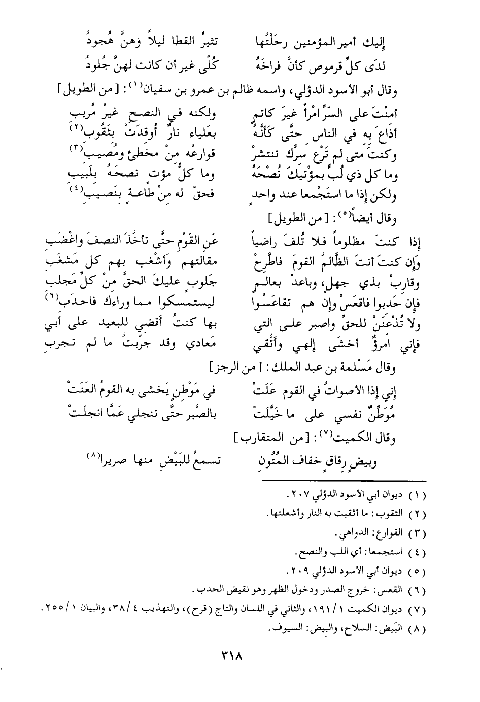 [7] ديوان الكميت 1/191، والثاني في اللسان والتاج (قرح) ، والتهذيب 4/38، والبيان 1/255.