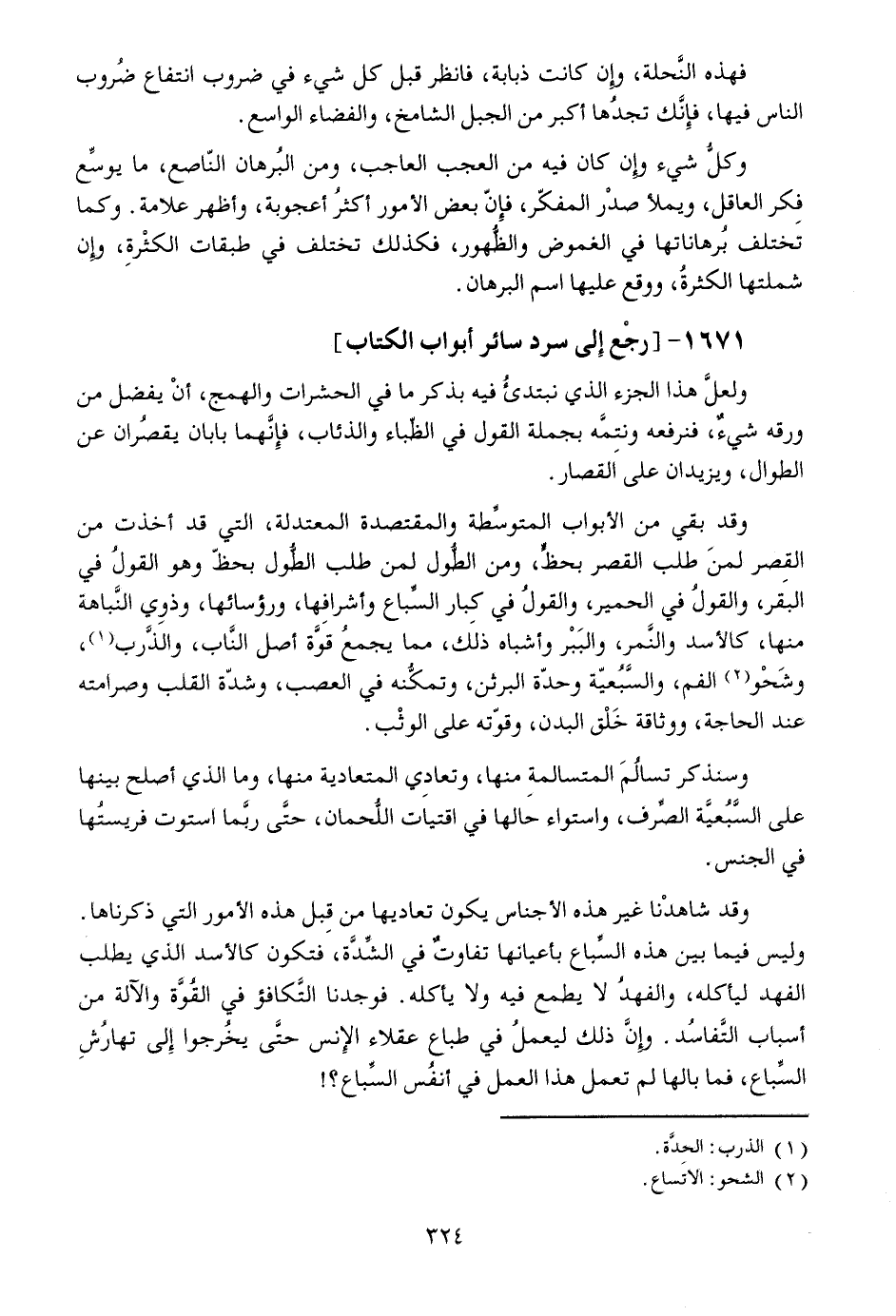 وكلّ شيء وإن كان فيه من العجب العاجب، ومن البرهان النّاصع، ما يوسّع فكر العاقل، ويملأ صدر المفكّر، فإنّ بعض الأمور أكثر أعجوبة، وأظهر علامة. وكما تختلف برهاناتها في الغموض والظّهور، فكذلك تختلف في طبقات الكثرة، وإن شملتها الكثرة، ووقع عليها اسم البرهان.