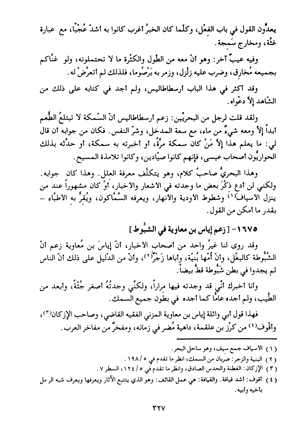 وقد أكثر في هذا الباب أرسطاطاليس، ولم أجد في كتابه على ذلك من الشّاهد إلّا دعواه.