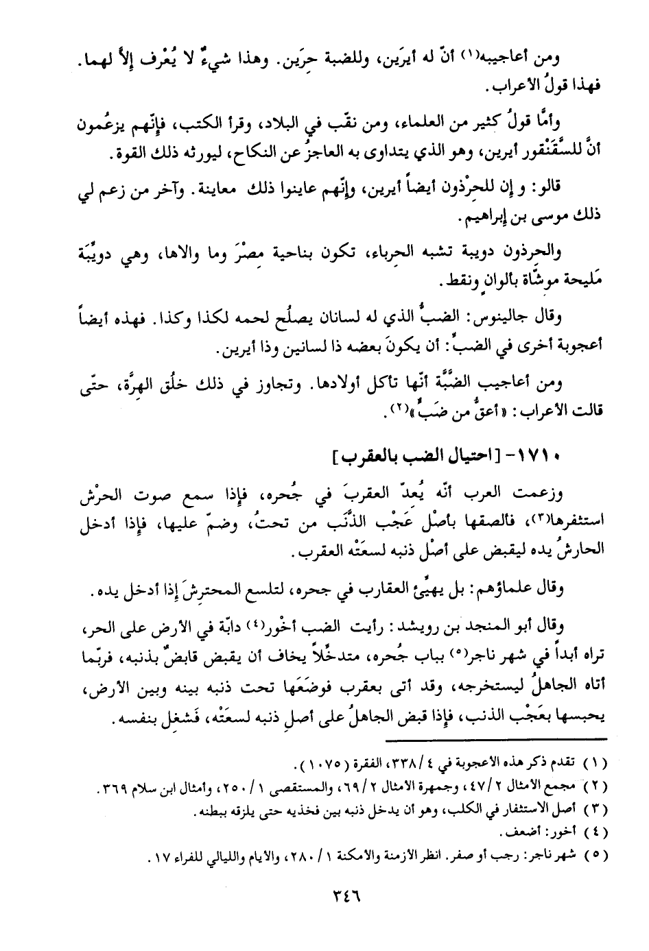 وقال أبو المنجد بن رويشد: رأيت الضب أخور [4] دابّة في الأرض على الحر، تراه أبدا في شهر ناجر [5] بباب جحره، متدخّلا يخاف أن يقبض قابض بذنبه، فربّما أتاه الجاهل ليستخرجه، وقد أتى بعقرب فوضعها تحت ذنبه بينه وبين الأرض، يحبسها بعجب الذنب، فإذا قبض الجاهل على أصل ذنبه لسعته، فشغل بنفسه.