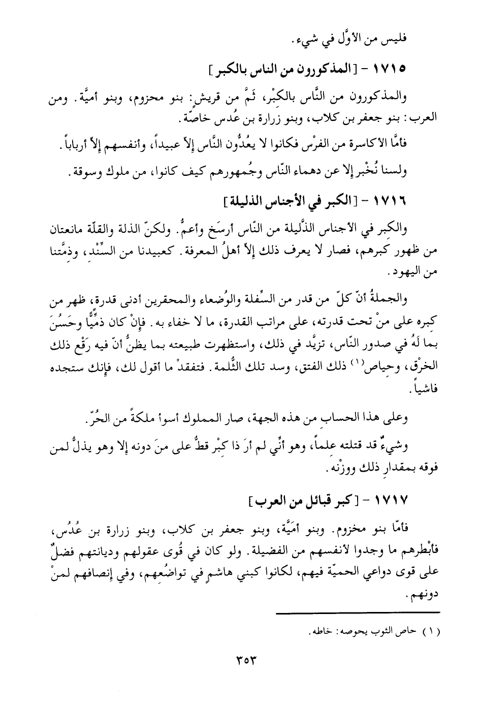 والكبر في الأجناس الذّليلة من النّاس أرسخ وأعمّ. ولكنّ الذلة والقلّة مانعتان من ظهور كبرهم، فصار لا يعرف ذلك إلّا أهل المعرفة. كعبيدنا من السّند، وذمّتنا من اليهود.