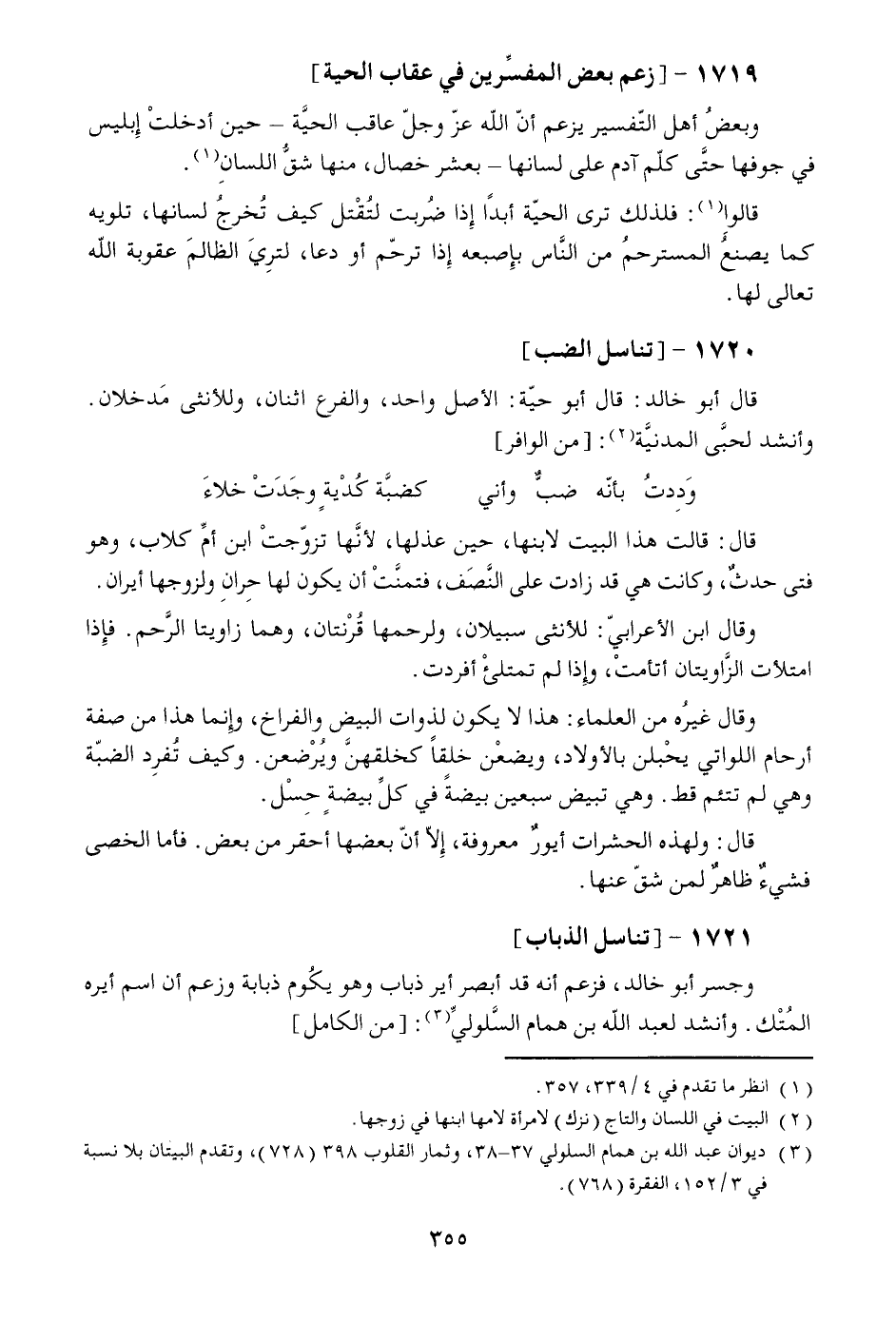 قالوا [1] : فلذلك ترى الحيّة أبدا إذا ضربت لتقتل كيف تخرج لسانها، تلويه كما يصنع المسترحم من النّاس بإصبعه إذا ترحّم أو دعا، لتري الظالم عقوبة الله تعالى لها.