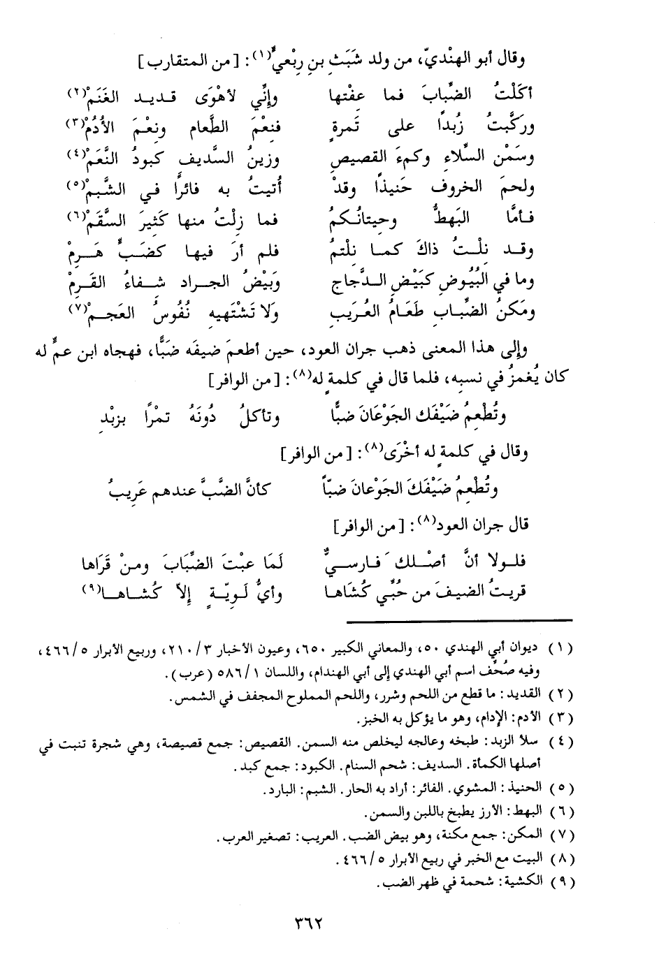 ومكن الضّباب طعام العريب ... ولا تشتهيه نفوس العجم [7]