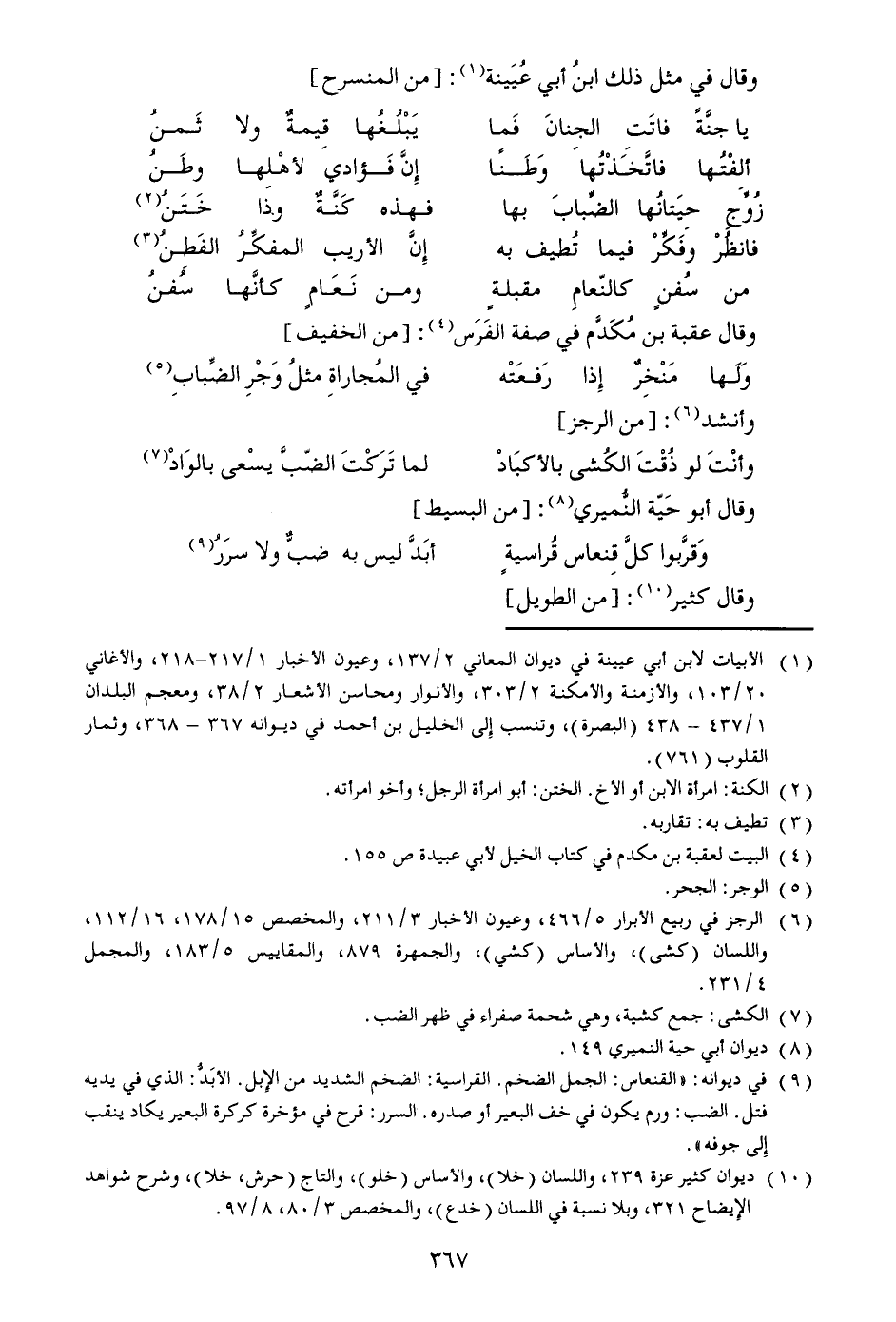 [9] في ديوانه: «القنعاس: الجمل الضخم. القراسية: الضخم الشديد من الإبل. الأبدّ: الذي في يديه فتل. الضب: ورم يكون في خف البعير أو صدره. السرر: قرح في مؤخرة كركرة البعير يكاد ينقب إلى جوفه» .
