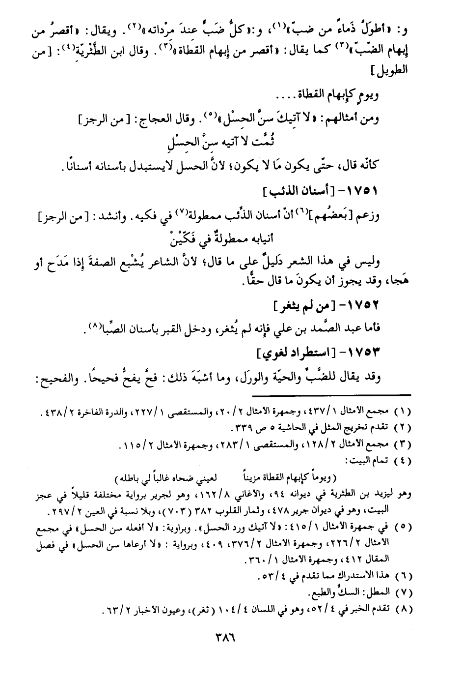 [5] في جمهرة الأمثال 1/415: «لا آتيك ورد الحسل» . وبرواية: «لا أفعله سن الحسل» في فصل المقال 412، وجمهرة الأمثال 1/360.