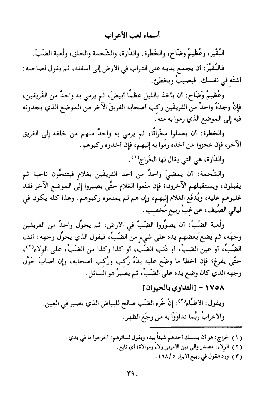 ولعبة الضّبّ: أن يصوّروا الضّبّ في الأرض، ثم يحوّل واحد من الفريقين وجهه، ثم يضع بعضهم يده على شيء من الضّبّ، فيقول الذي يحوّل وجهه: أنف الضّبّ، أو عين الضبّ، أو ذنب الضّب، أو كذا وكذا من الضّبّ، على الولاء [2] ، حتّى يفرغ؛ فإن أخطأ ما وضع عليه يده ركب وركب أصحابه، وإن أصحاب حوّل وجهه الذي كان وضع يده على الضّبّ، ثم يصير هو السائل.