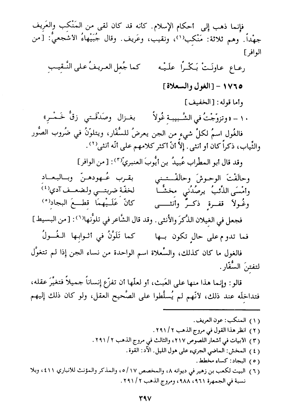 فالغول اسم لكلّ شيء من الجن يعرض للسّفّار، ويتلوّن في ضروب الصّور والثّياب، ذكرا كان أو أنثى. إلّا أنّ أكثر كلامهم على أنّه أنثى [2] .