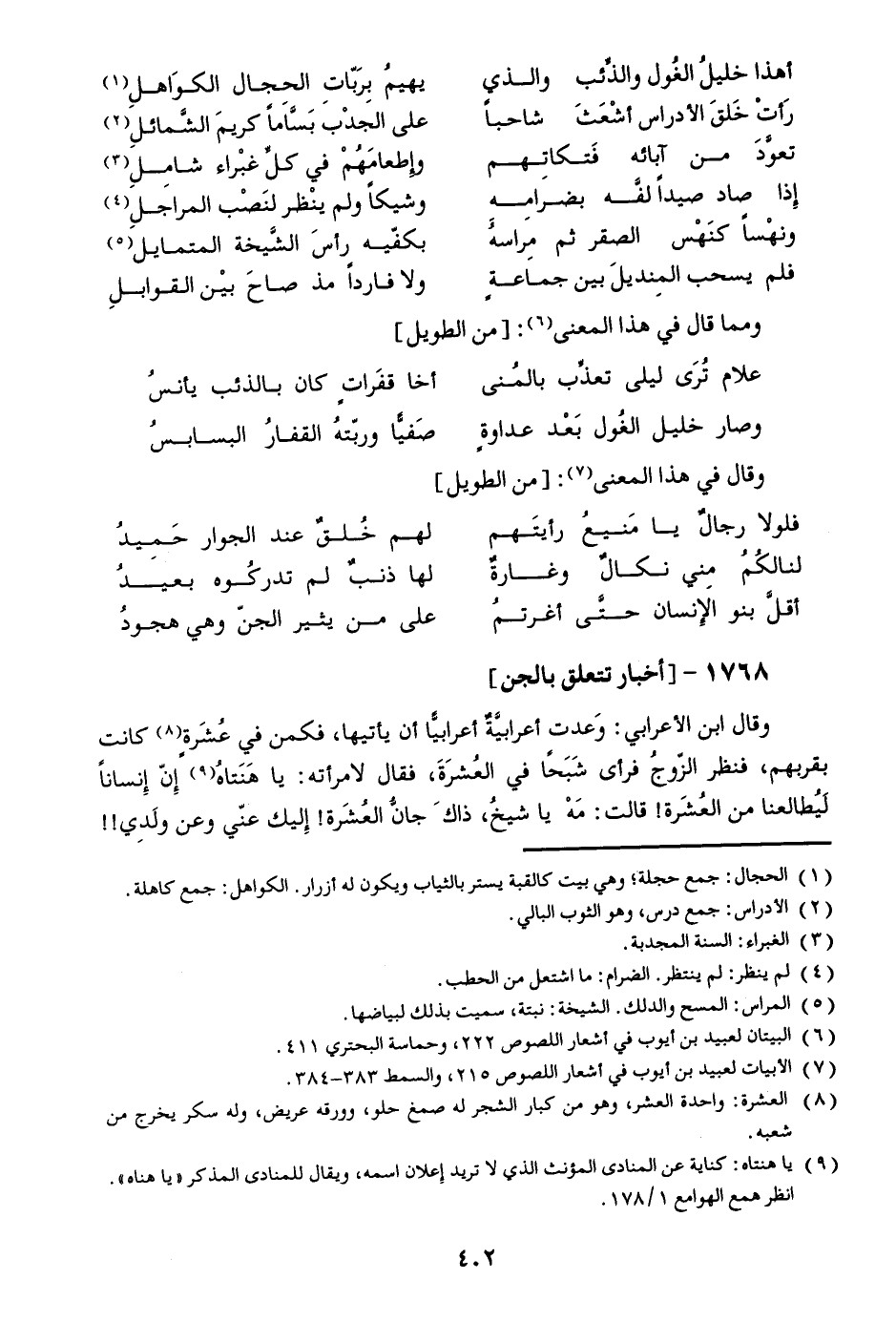 وقال ابن الأعرابي: وعدت أعرابيّة أعرابيّا أن يأتيها، فكمن في عشرة [8] كانت بقربهم، فنظر الزّوج فرأى شبحا في العشرة، فقال لامرأته: يا هنتاه [9] إنّ إنسانا ليطالعنا من العشرة! قالت: مه يا شيخ، ذاك جانّ العشرة! إليك عنّي وعن ولدي!!
