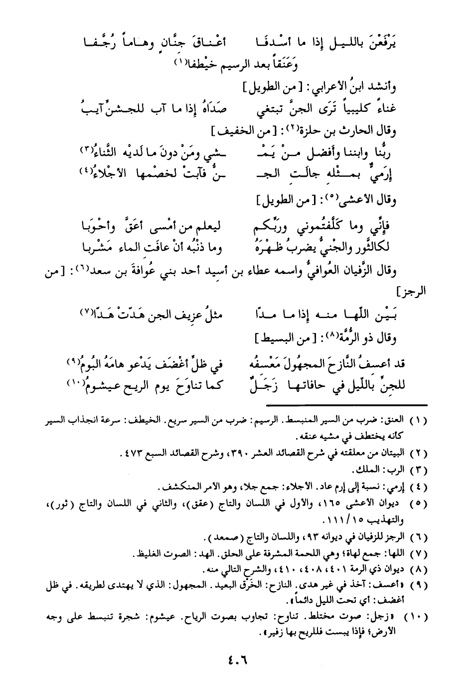 [9] «أعسف: آخذ في غير هدى. النازح: الخرق البعيد. المجهول: الذي لا يهتدى لطريقه. في ظل أغضف: أي تحت الليل دائما» .