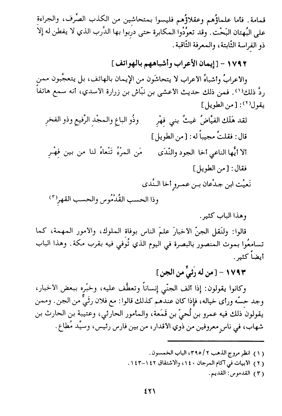 والأعراب وأشباه الأعراب لا يتحاشون من الإيمان بالهاتف، بل يتعجّبون ممن ردّ ذلك [1] . فمن ذلك حديث الأعشى بن نبّاش بن زرارة الأسدي، أنه سمع هاتفا يقول [2] : [من الطويل]