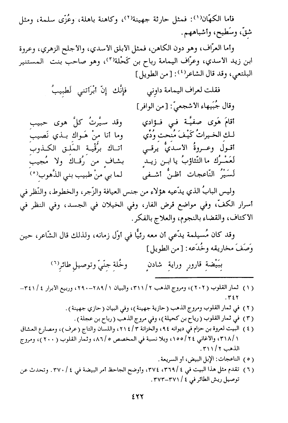 وأما العرّاف، وهو دون الكاهن، فمثل الأبلق الأسدي، والأجلح الزهري، وعروة ابن زيد الأسدي، وعرّاف اليمامة رباح بن كحلة [3] ، وهو صاحب بنت المستنير البلتعي، وقد قال الشاعر [4] : [من الطويل]