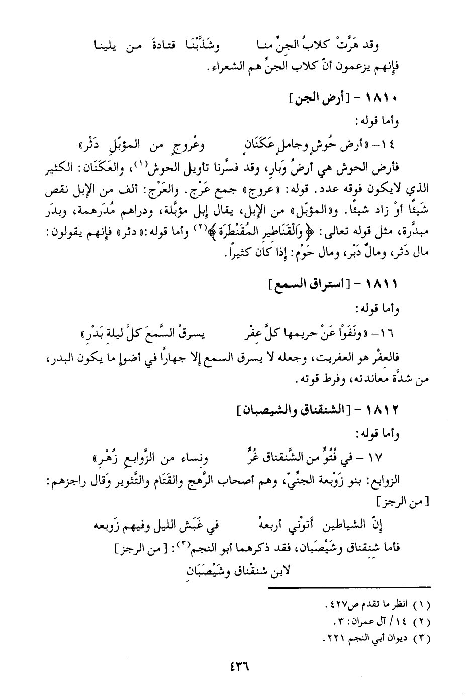 فأرض الحوش هي أرض وبار، وقد فسّرنا تأويل الحوش [1] ، والعكنان: الكثير الذي لا يكون فوقه عدد. قوله: «عروج» جمع عرج. والعرج: ألف من الإبل نقص شيئا أو زاد شيئا. و «المؤبّل» من الإبل، يقال إبل مؤبّلة، ودراهم مدرهمة، وبدر مبدّرة، مثل قوله تعالى: وَالْقَناطِيرِ الْمُقَنْطَرَةِ