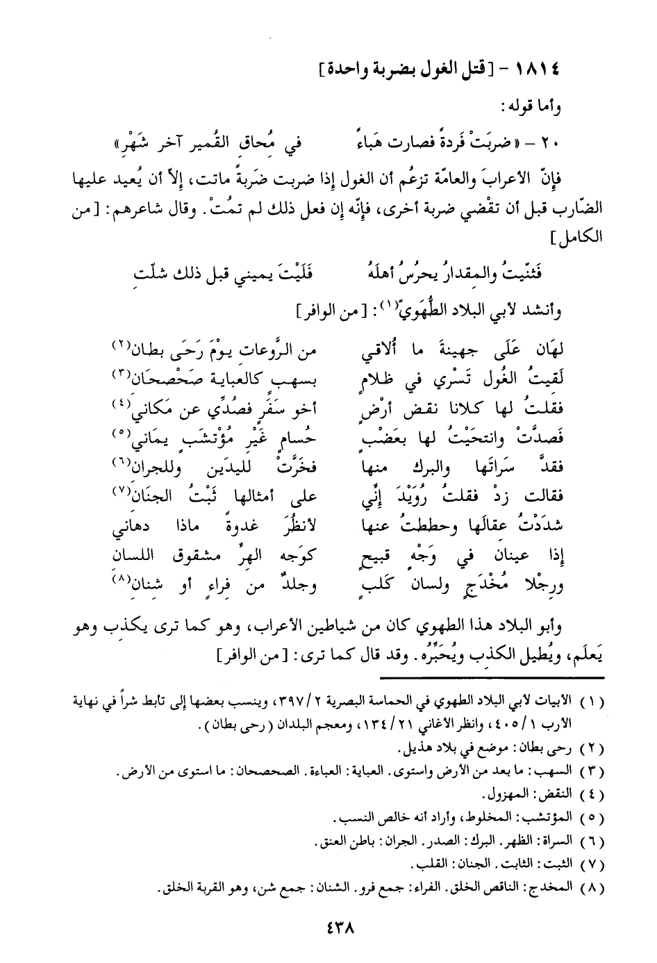 فإنّ الأعراب والعامّة تزعم أن الغول إذا ضربت ضربة ماتت، إلّا أن يعيد عليها الضّارب قبل أن تقضي ضربة أخرى، فإنّه إن فعل ذلك لم تمت. وقال شاعرهم: [من الكامل]