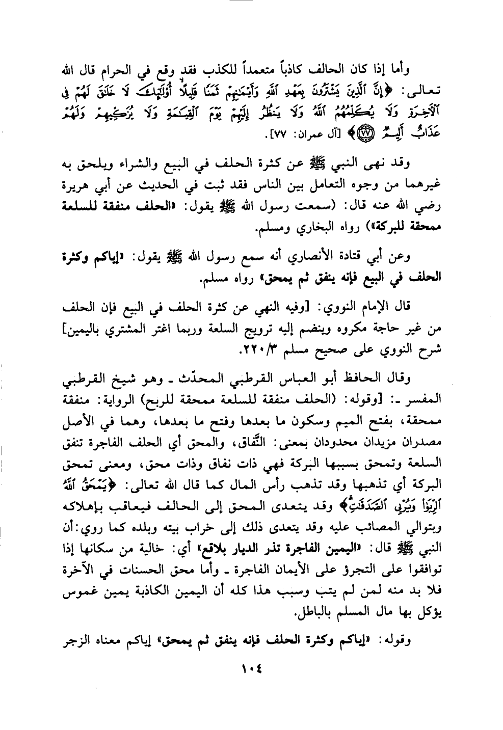 وقال الحافظ أبو العباس القرطبي المحدّث - وهو شيخ القرطبي المفسر -: [وقوله: (الحلف منفقة للسلعة ممحقة للربح) الرواية: منفقة ممحقة - بفتح الميم وسكون ما بعدها وفتح مابعدها - وهما في الأصل مصدران مزيدان محدودان بمعنى: النَّفاق. والمحق أي الحلف الفاجرة تنفق السلعة وتمحق بسببها البركة فهي ذات نفاق وذات محق. ومعنى تمحق البركة أي تذهبها وقد تذهب رأس المال كما قال الله تعالى: (يَمْحَقُ اللَّهُ الرِّبَا وَيُرْبِي الصَّدَقَاتِ) وقد يتعدى المحق إلى الحالف فيعاقب بإهلاكه وبتوالي المصائب عليه وقد يتعدى ذلك إلى خراب بيته وبلده كما روي: أن النبي - صلى الله عليه وسلم - قال: (اليمين الفاجرة تذر الديار بلاقع) أي: خالية من سكانها إذا توافقوا على التجرؤ على الأيمان الفاجرة. وأما محق الحسنات في الآخرة فلا بد منه لمن لم يتب وسبب هذا كله أن اليمين الكاذبة يمين غموس يؤكل بها مال المسلم بالباطل.